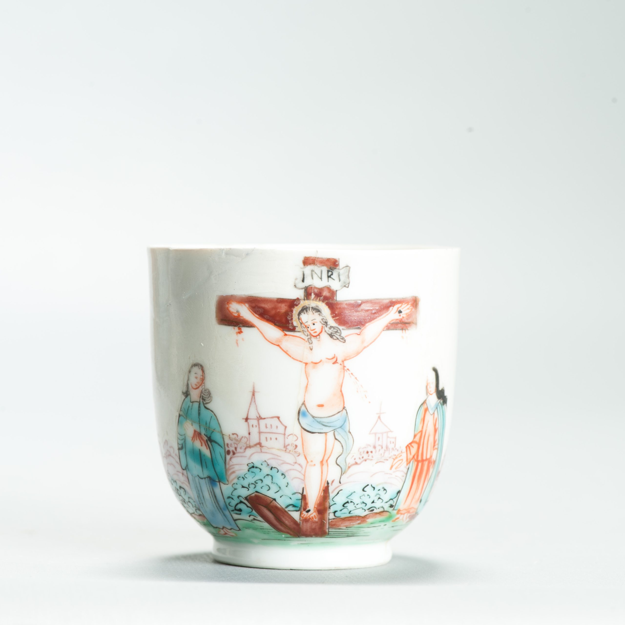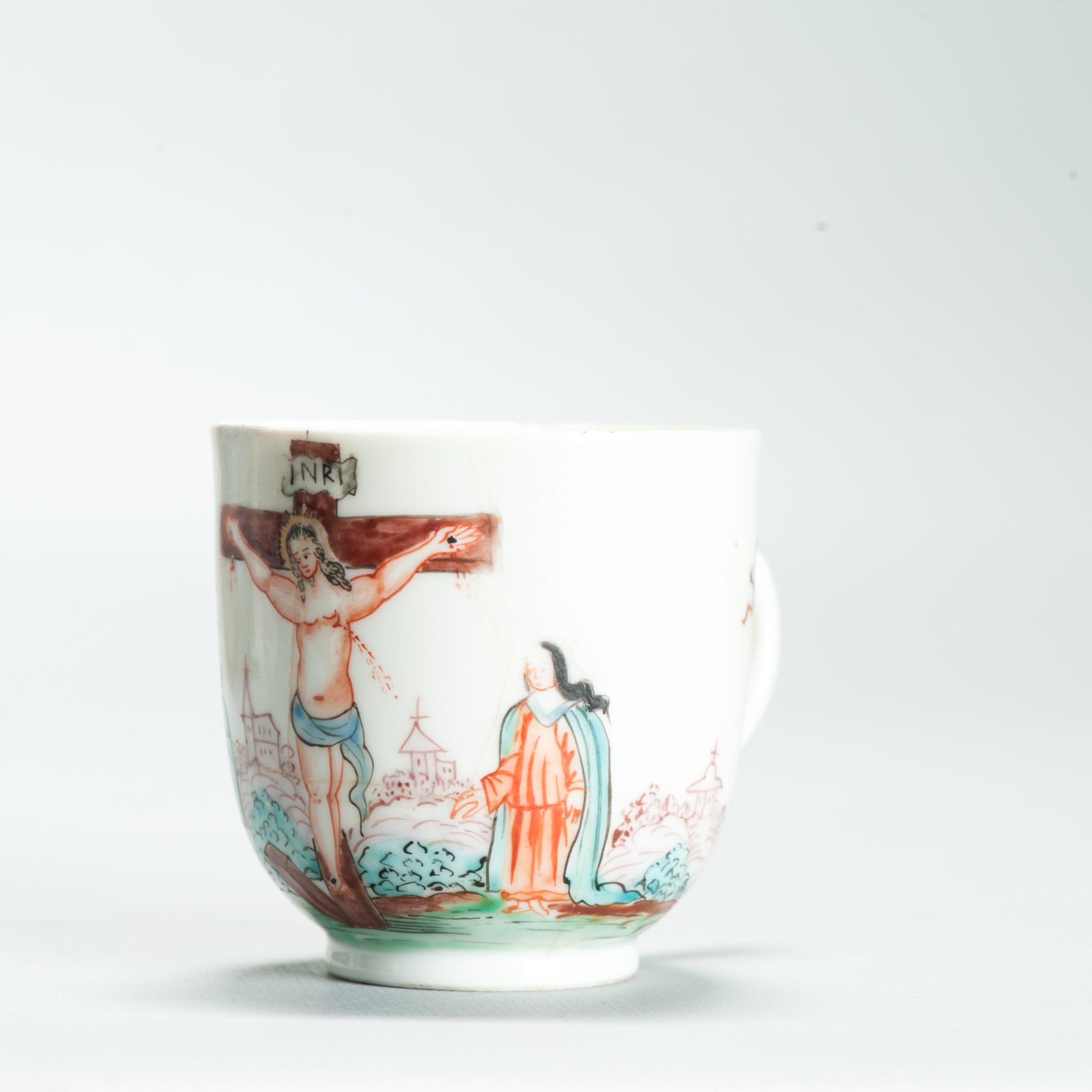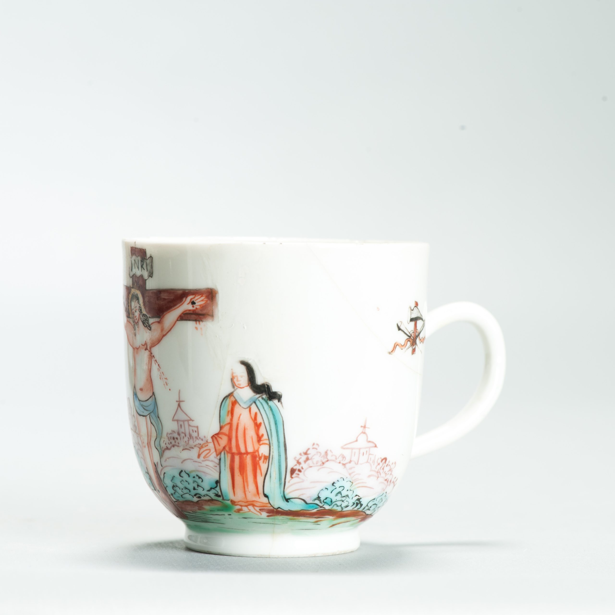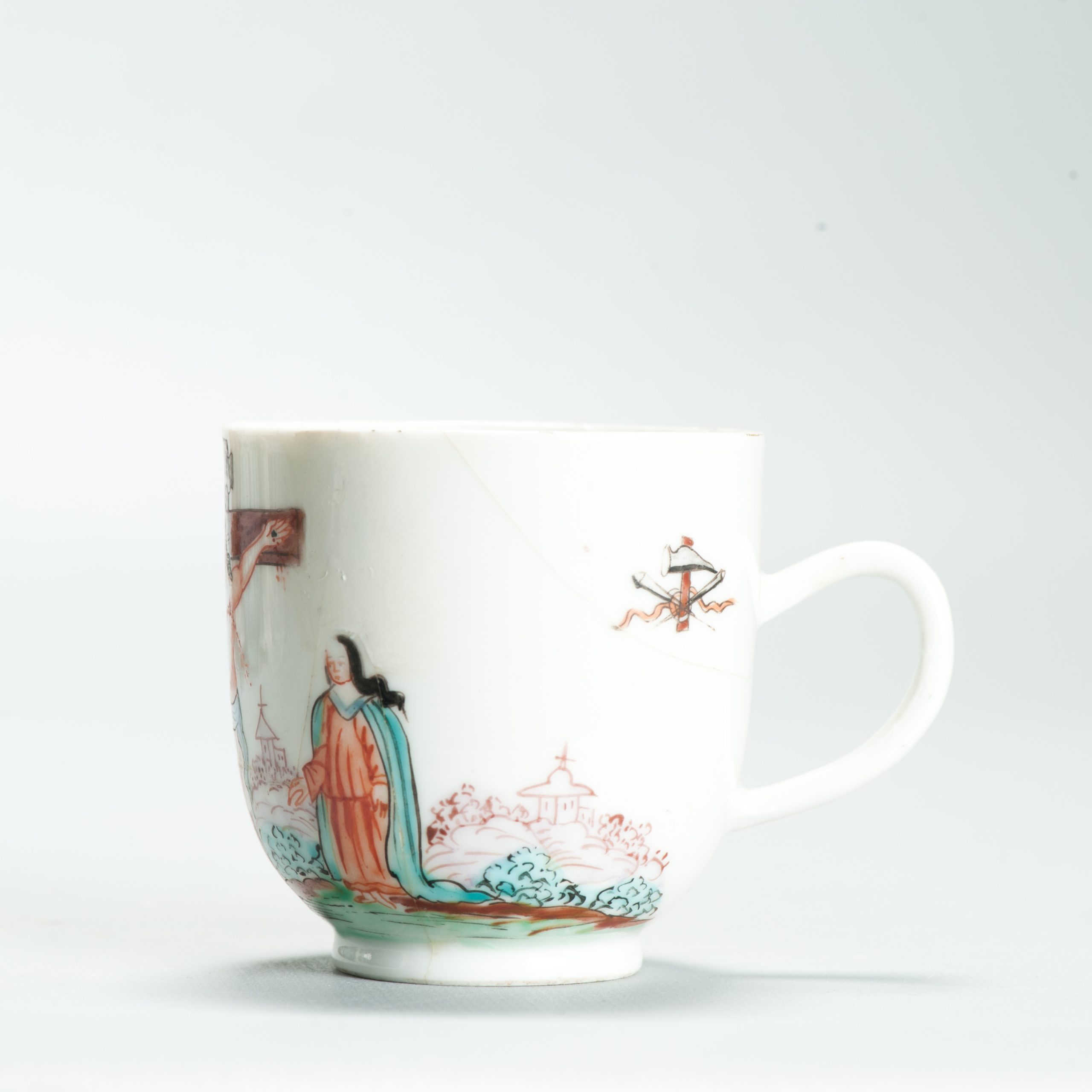 1639 Antique Chinese Lovely and very rare Amsterdam Bont tea bowl and saucer showing the cruxifiction of Jesus Christ.