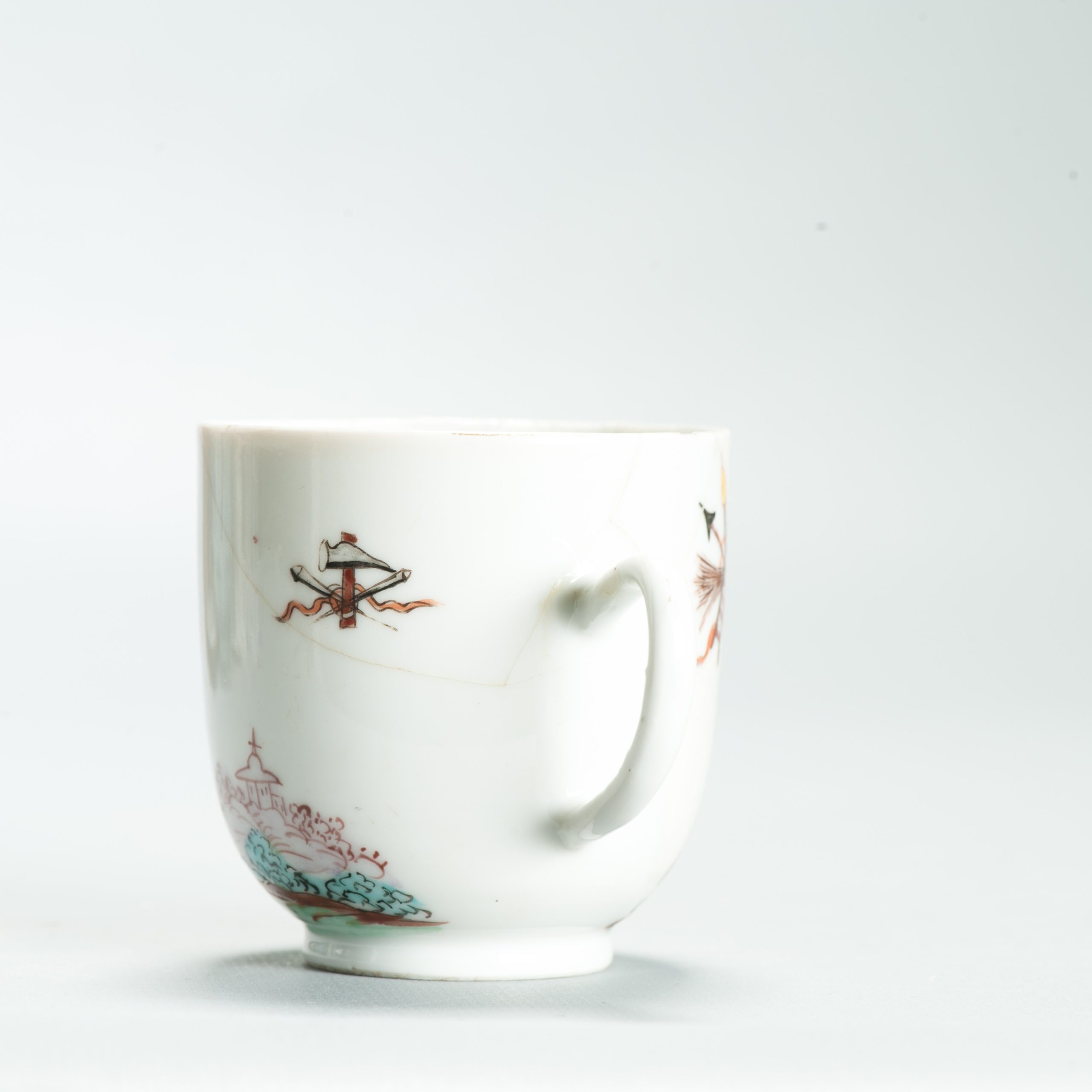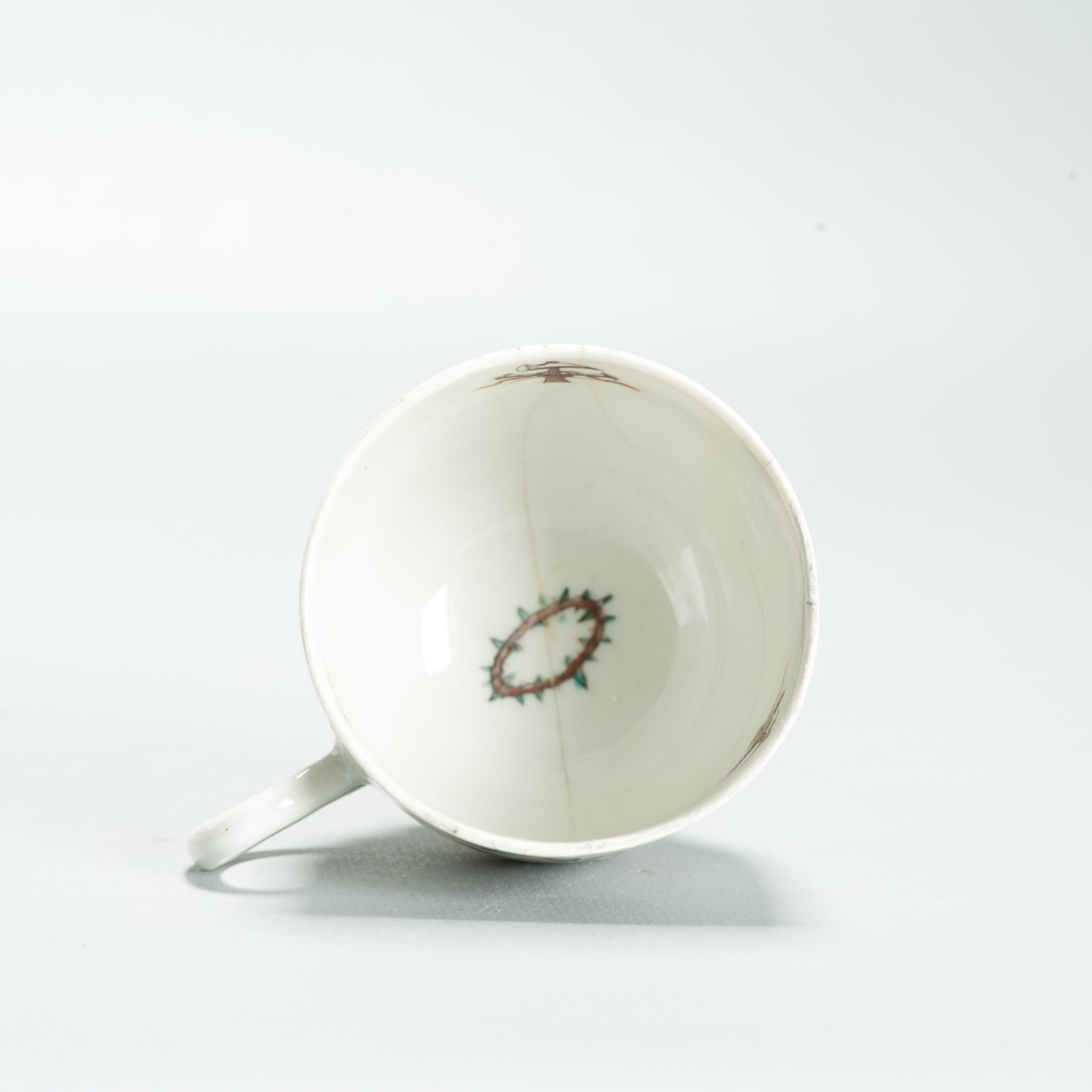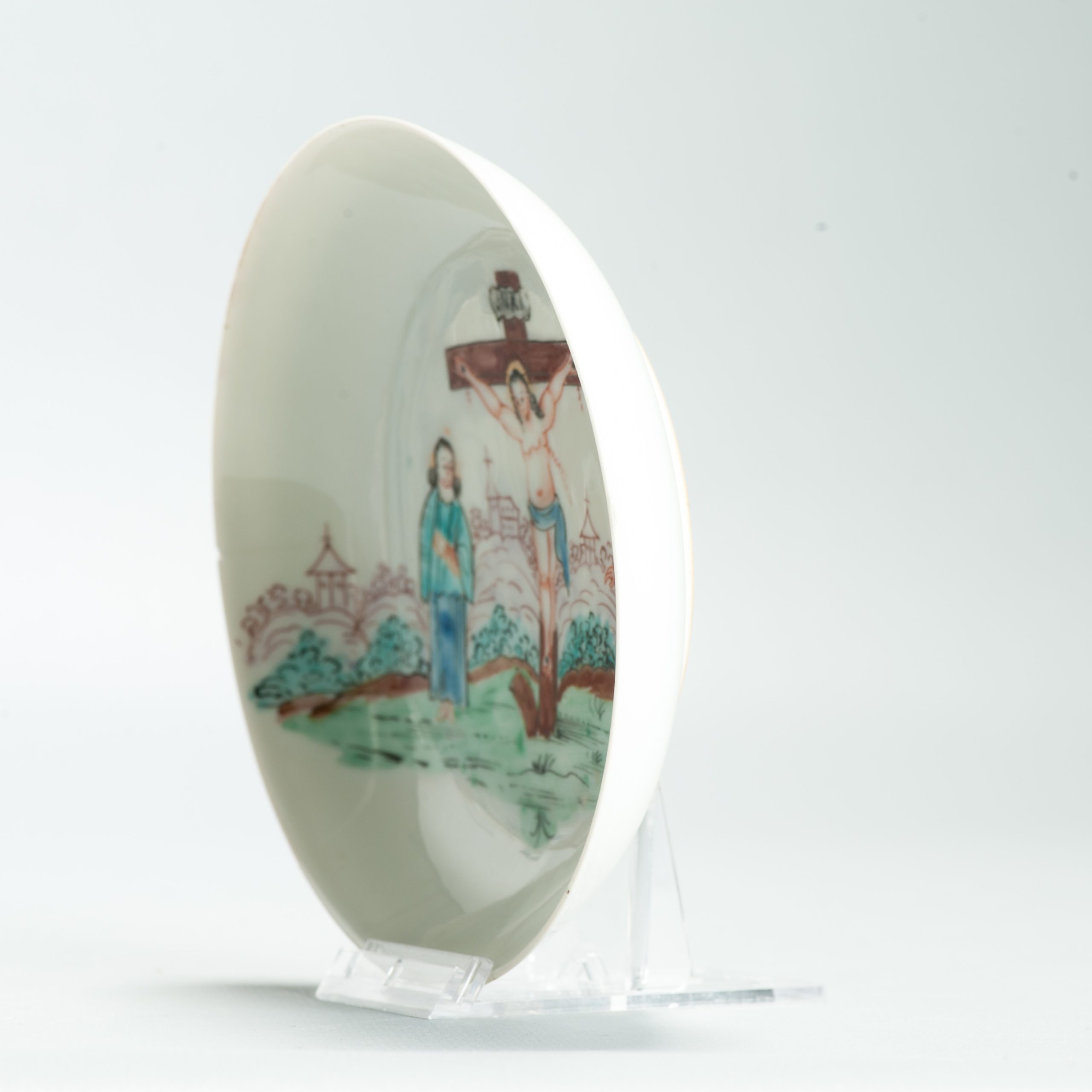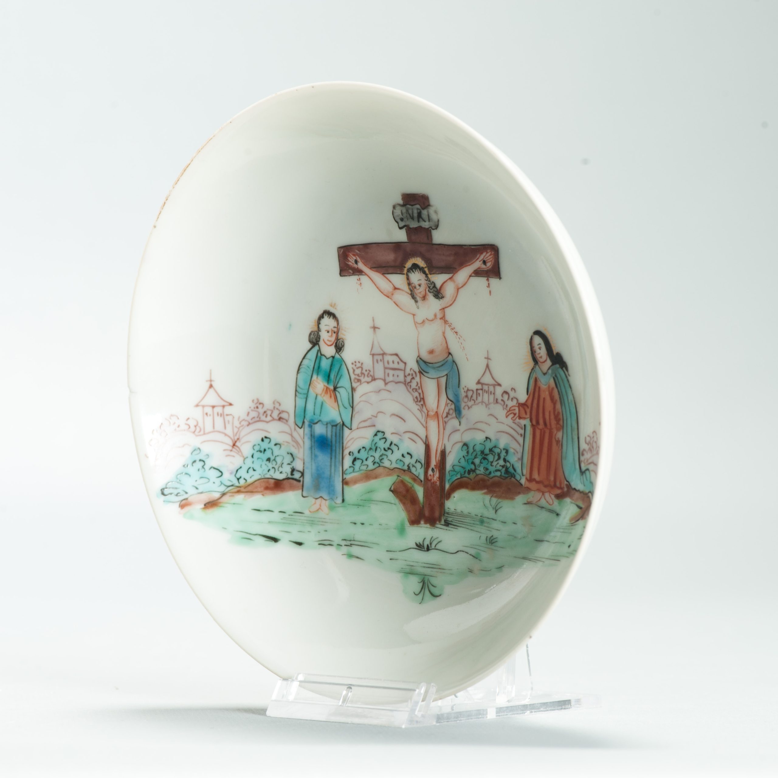 1639 Antique Chinese Lovely and very rare Amsterdam Bont tea bowl and saucer showing the cruxifiction of Jesus Christ.