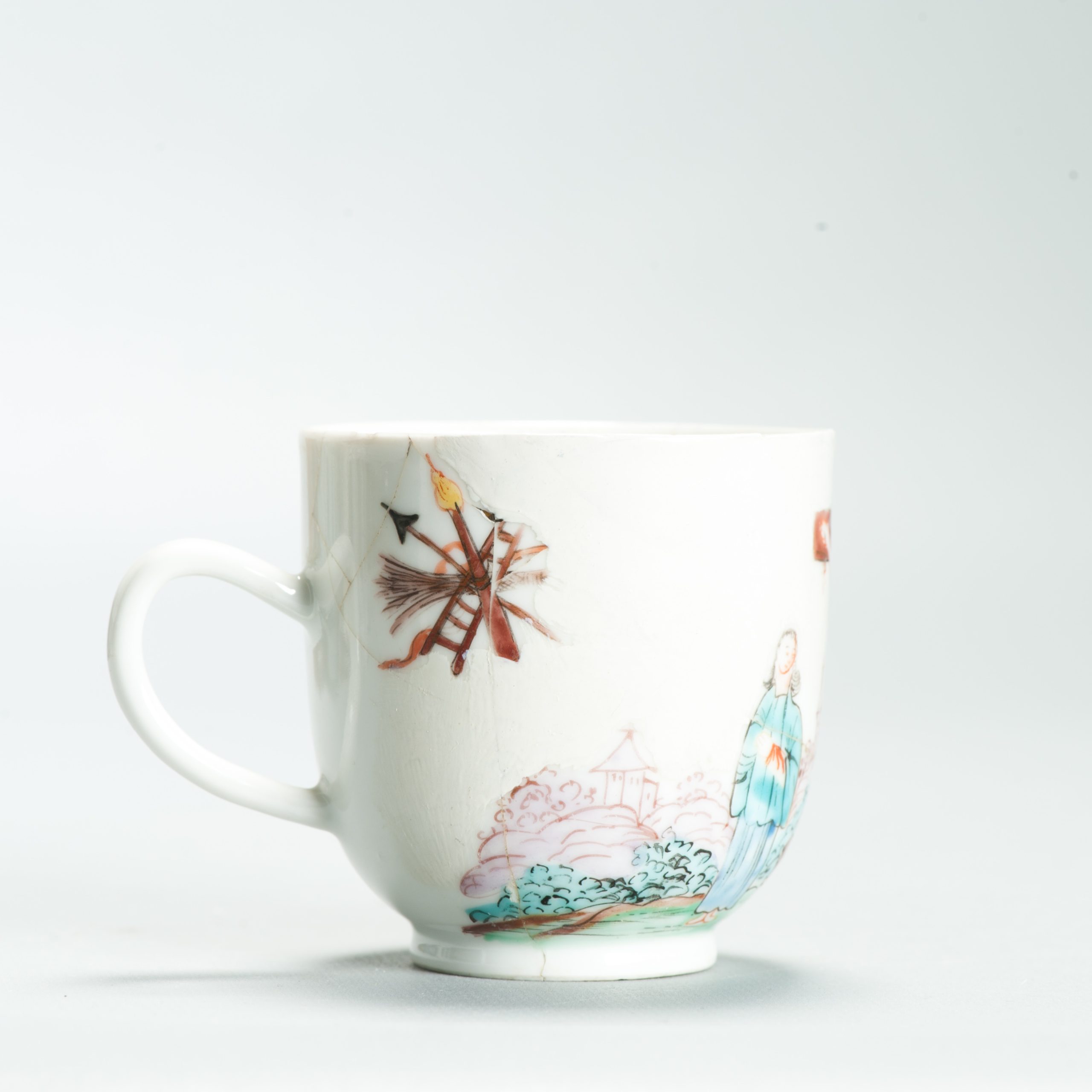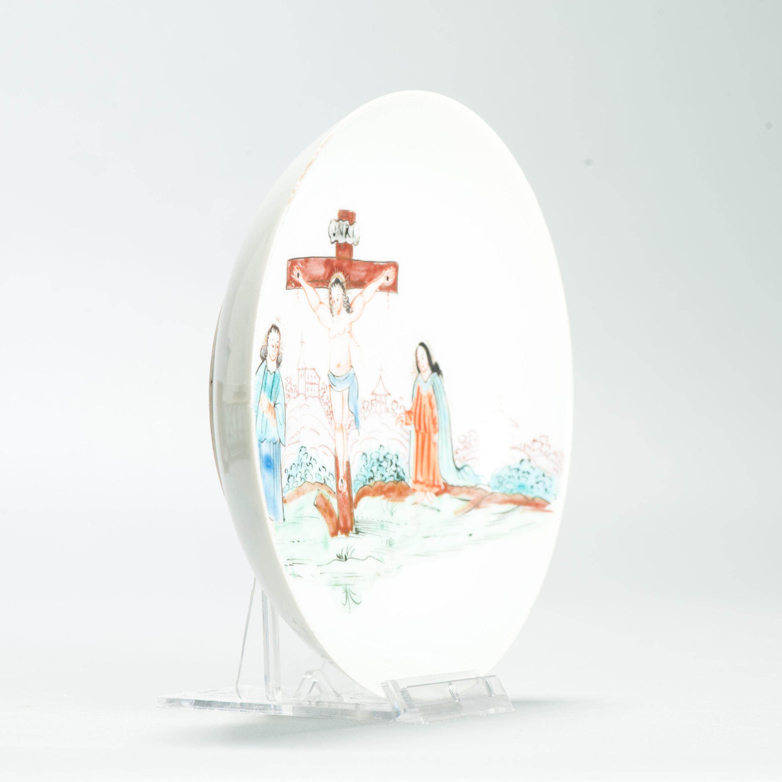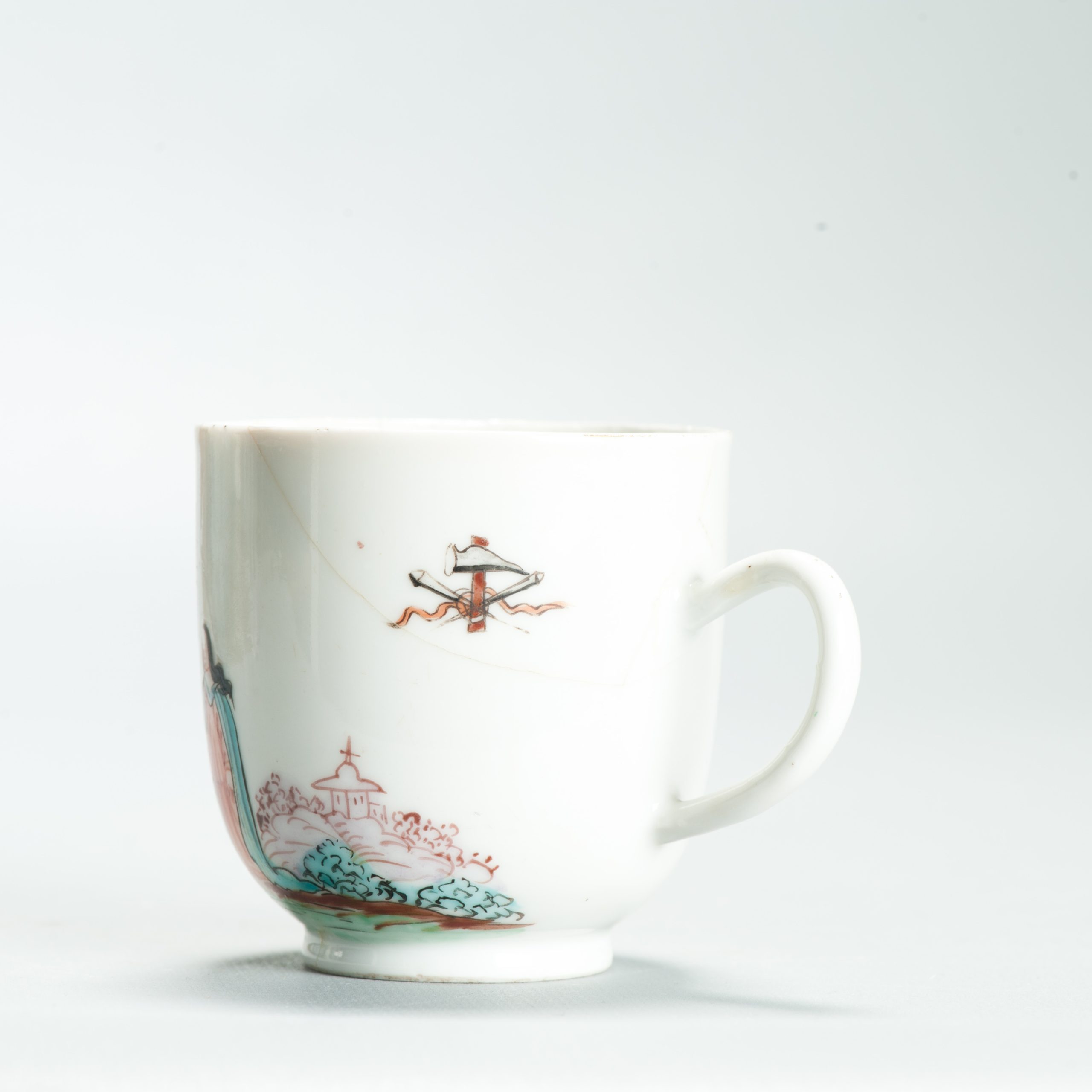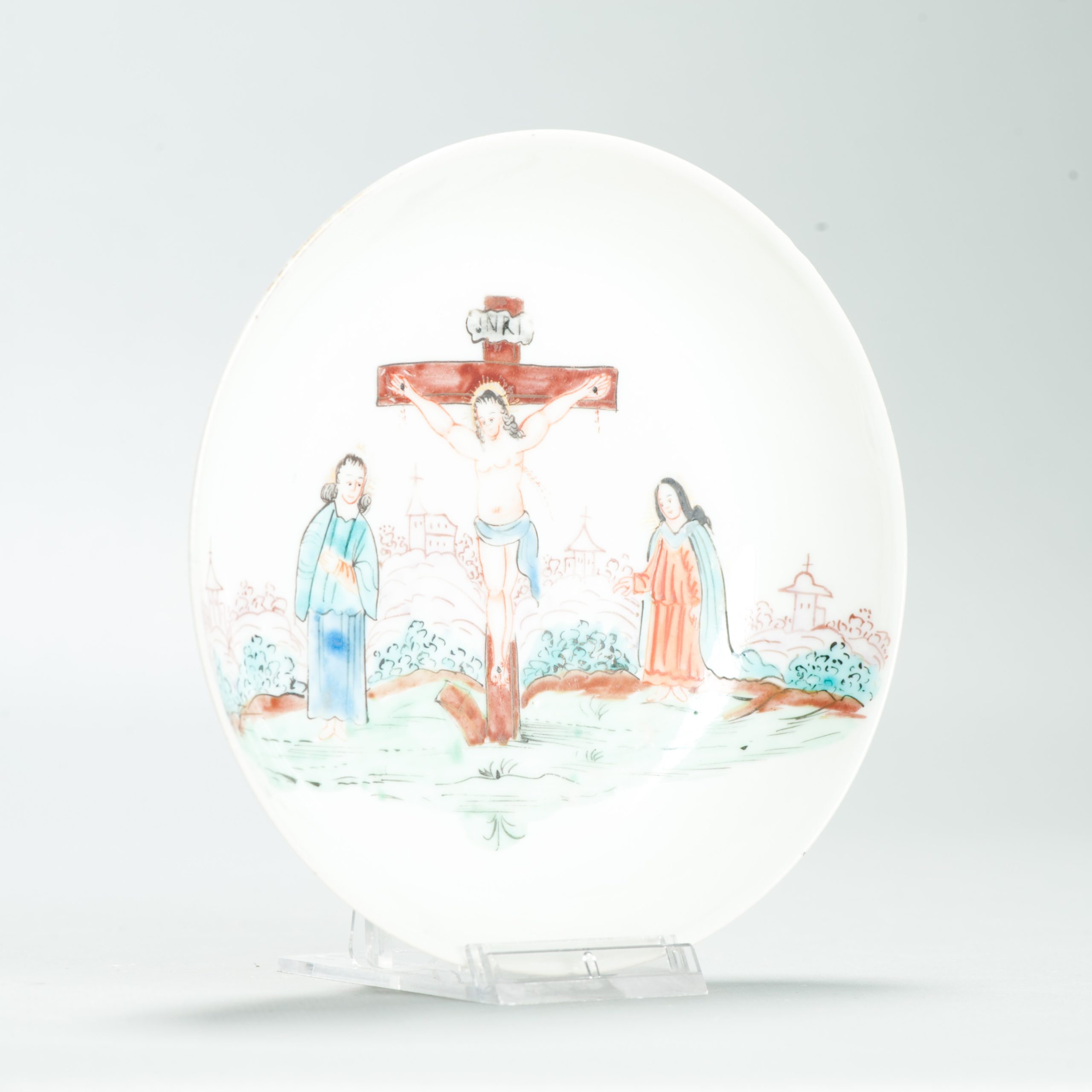 1639 Antique Chinese Lovely and very rare Amsterdam Bont tea bowl and saucer showing the cruxifiction of Jesus Christ.