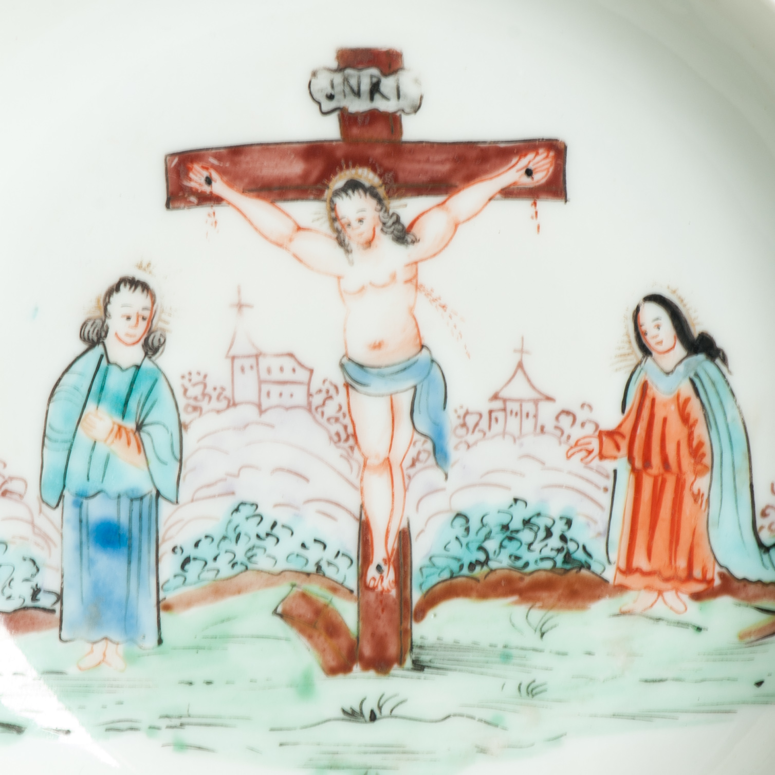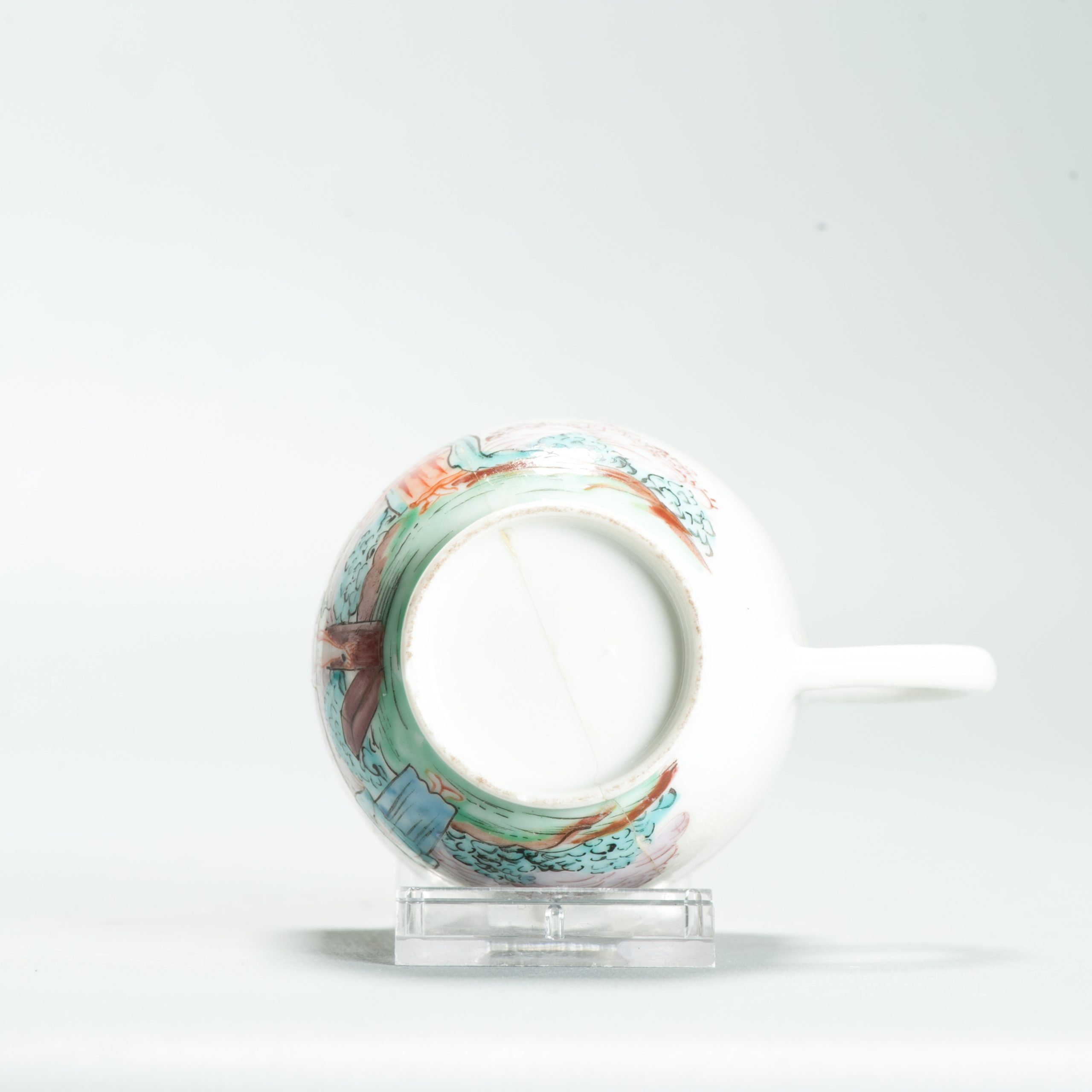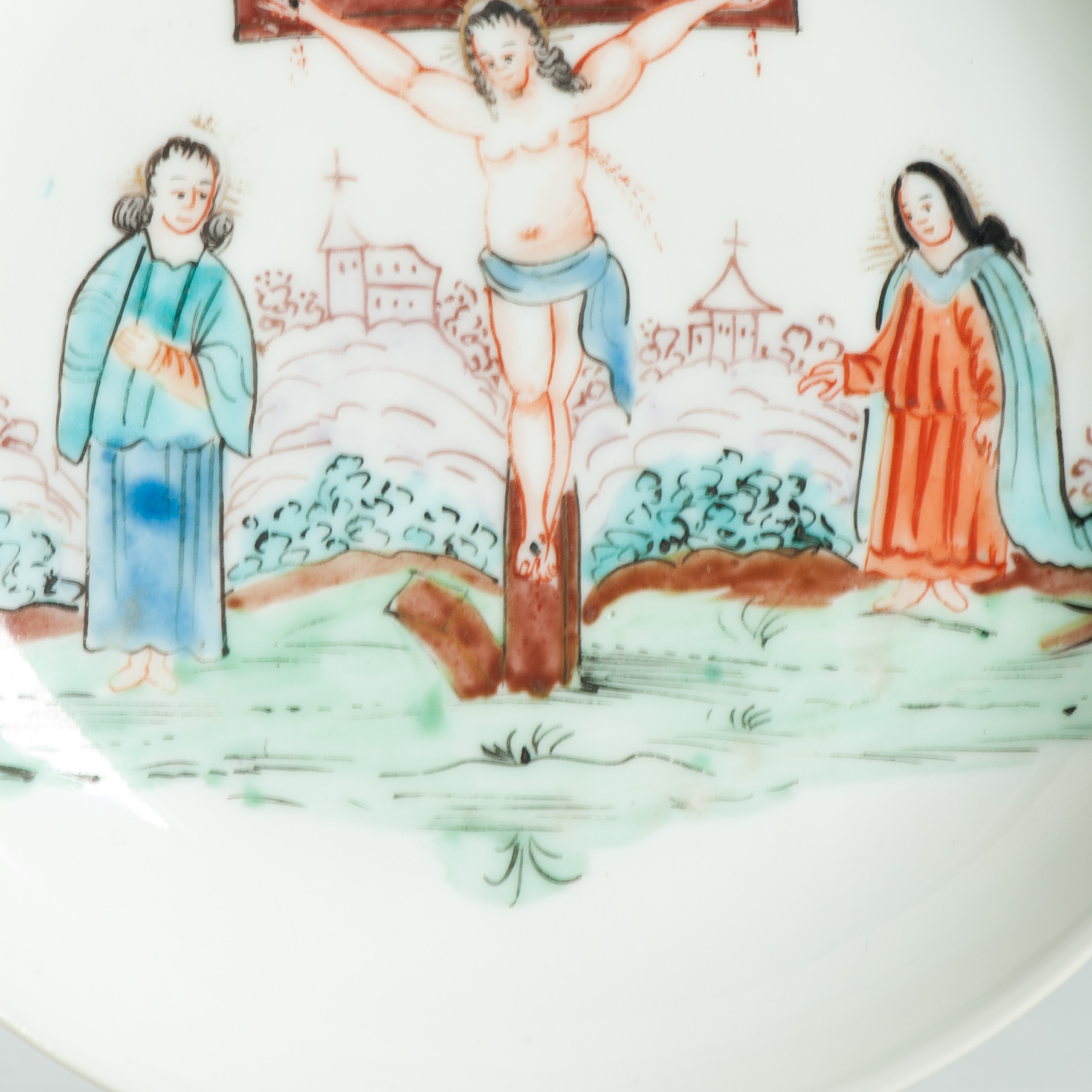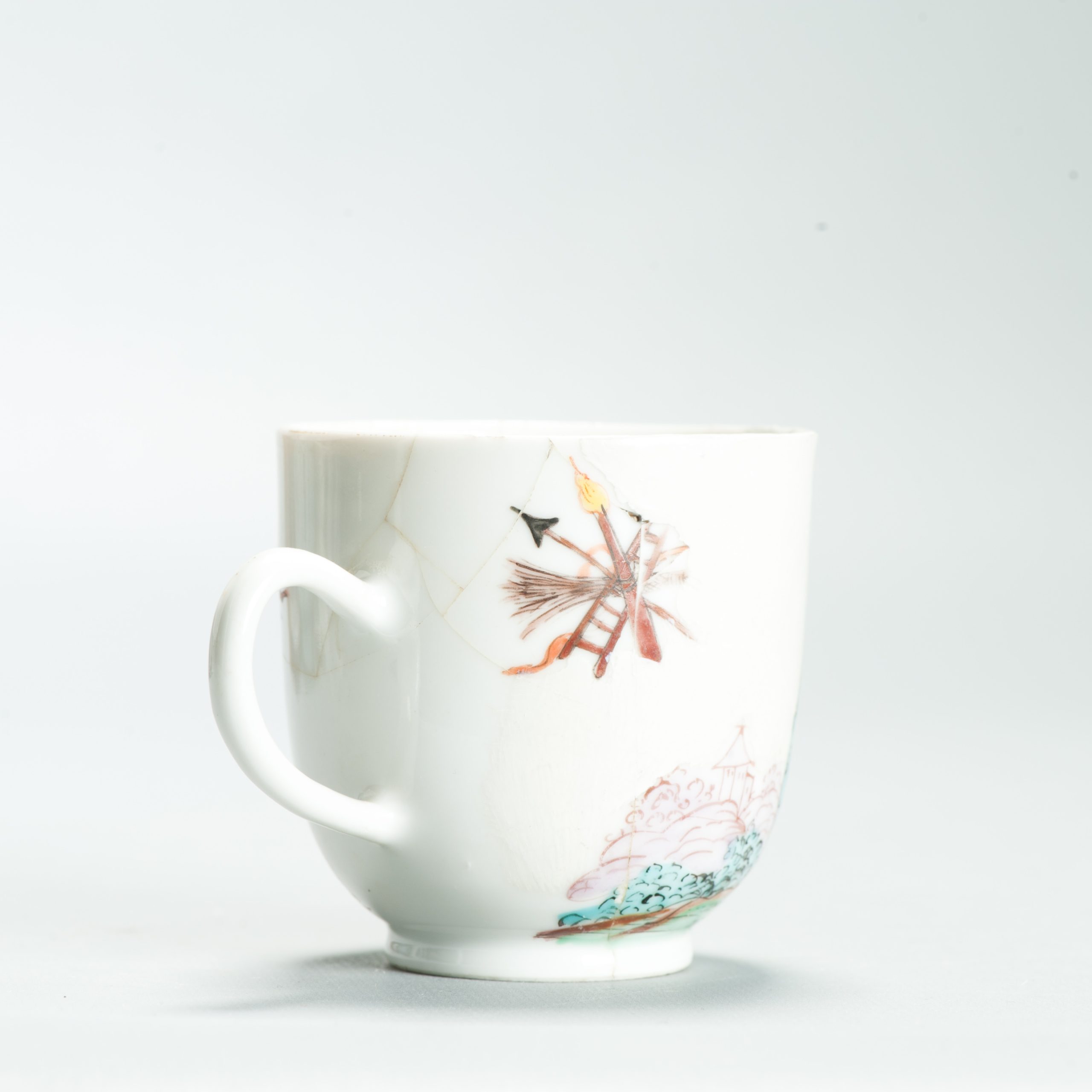 1639 Antique Chinese Lovely and very rare Amsterdam Bont tea bowl and saucer showing the cruxifiction of Jesus Christ.