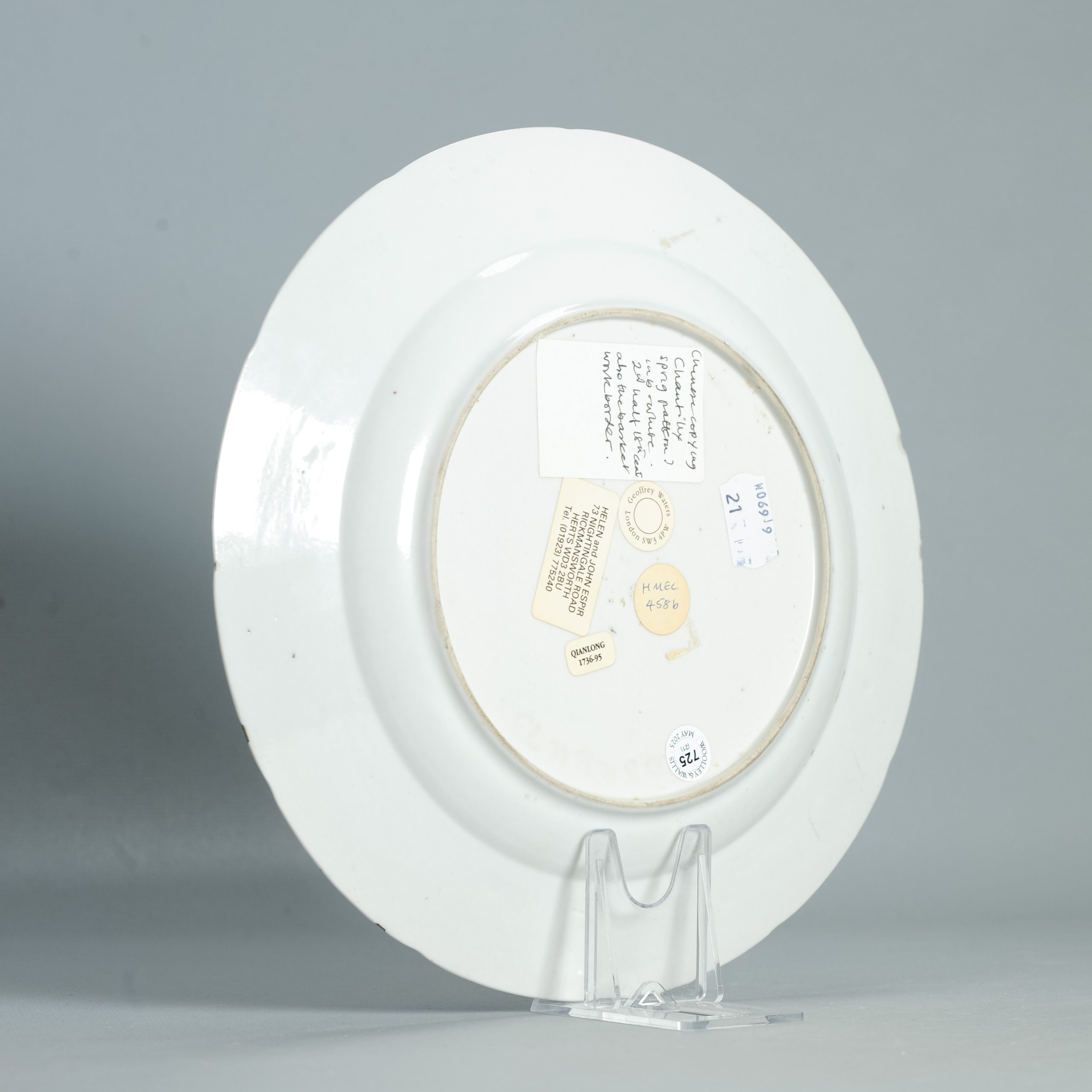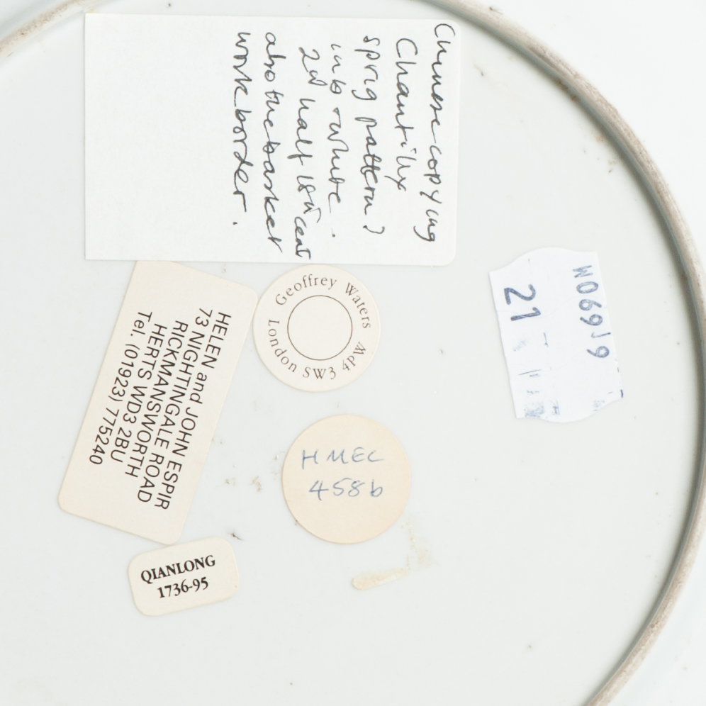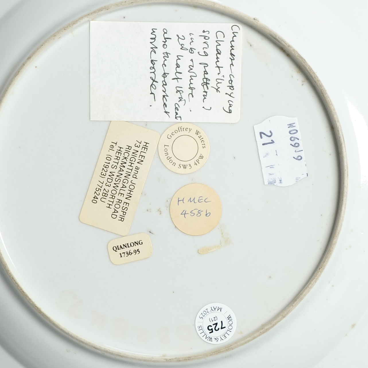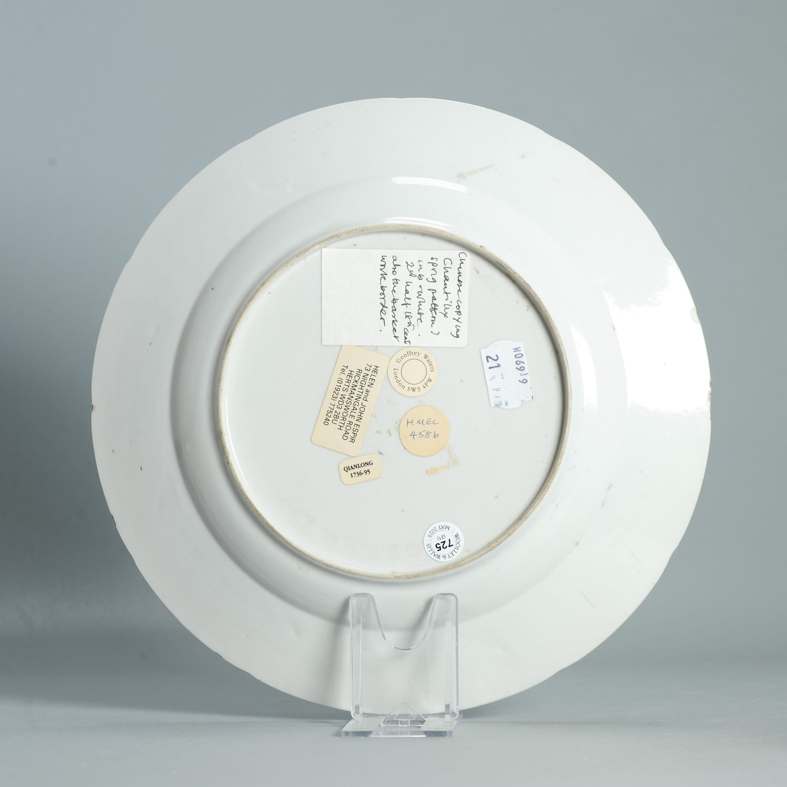 Espir, Helen. European Decoration on Oriental Porcelain, 1700–1830. London/Lisbon: Jorge Welsh Books, 2005.English Regency redecorated plate. This one is rather complicated. Its a very high quality Chinese Qianlong export dish (of the type sometimes called Imperial Quality on export ware) dating to around 1750-1770 with a decoration that copies the famous French Chantilly Sprig pattern. A design that emerged in the 1730/40s on Chantilly Soft past porcelain and was later copied around Europe and also in China. This plate was than later redecorated in the Regency style around 1800-1820 to fit the new fashion of the regency period.
