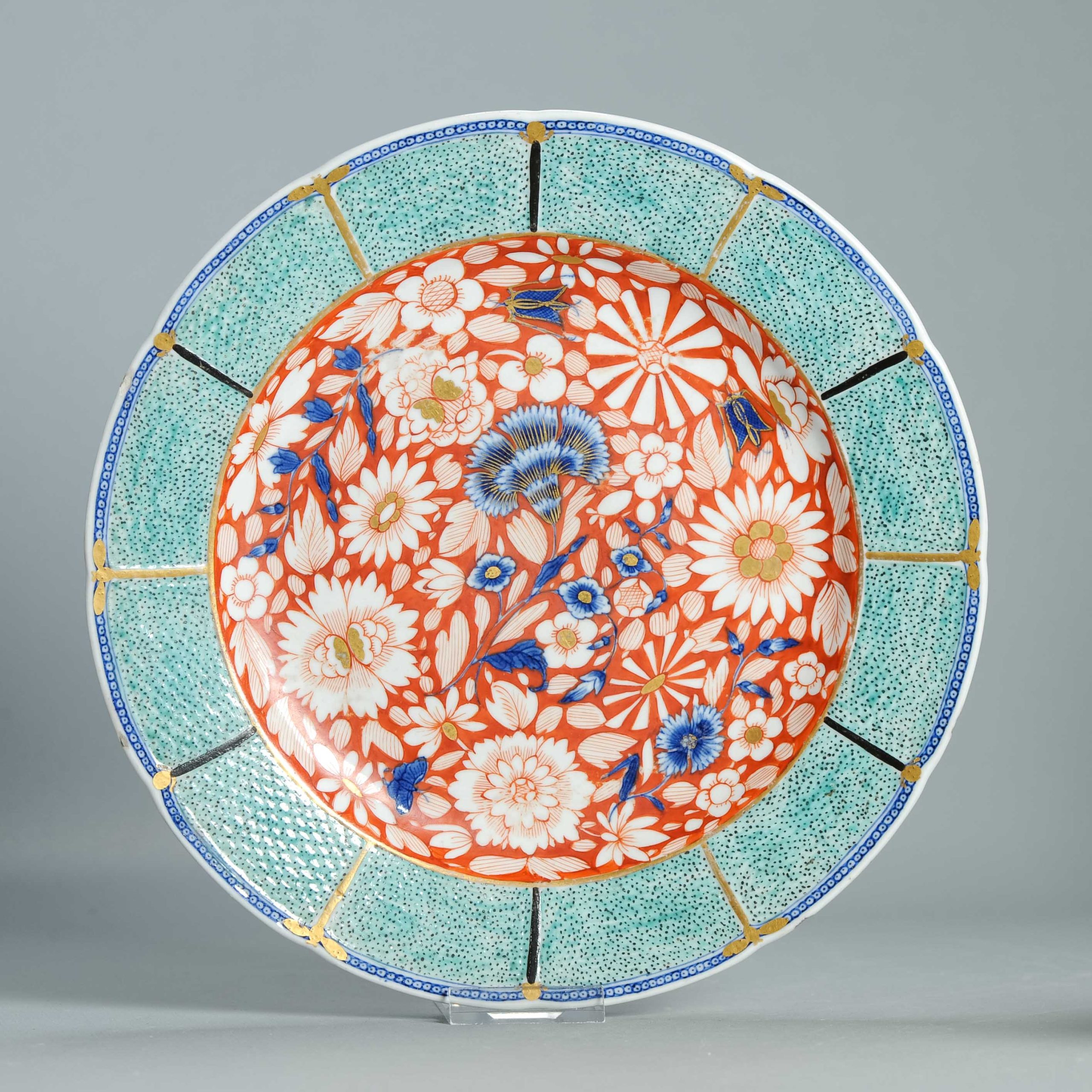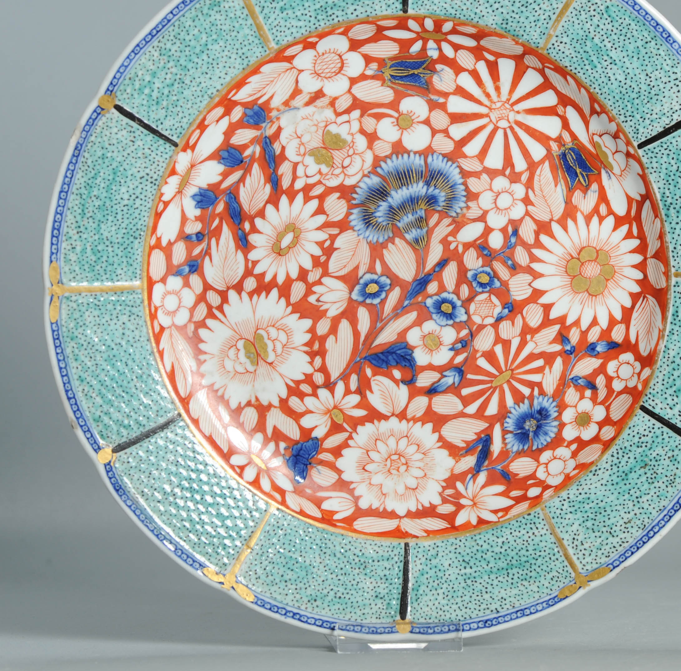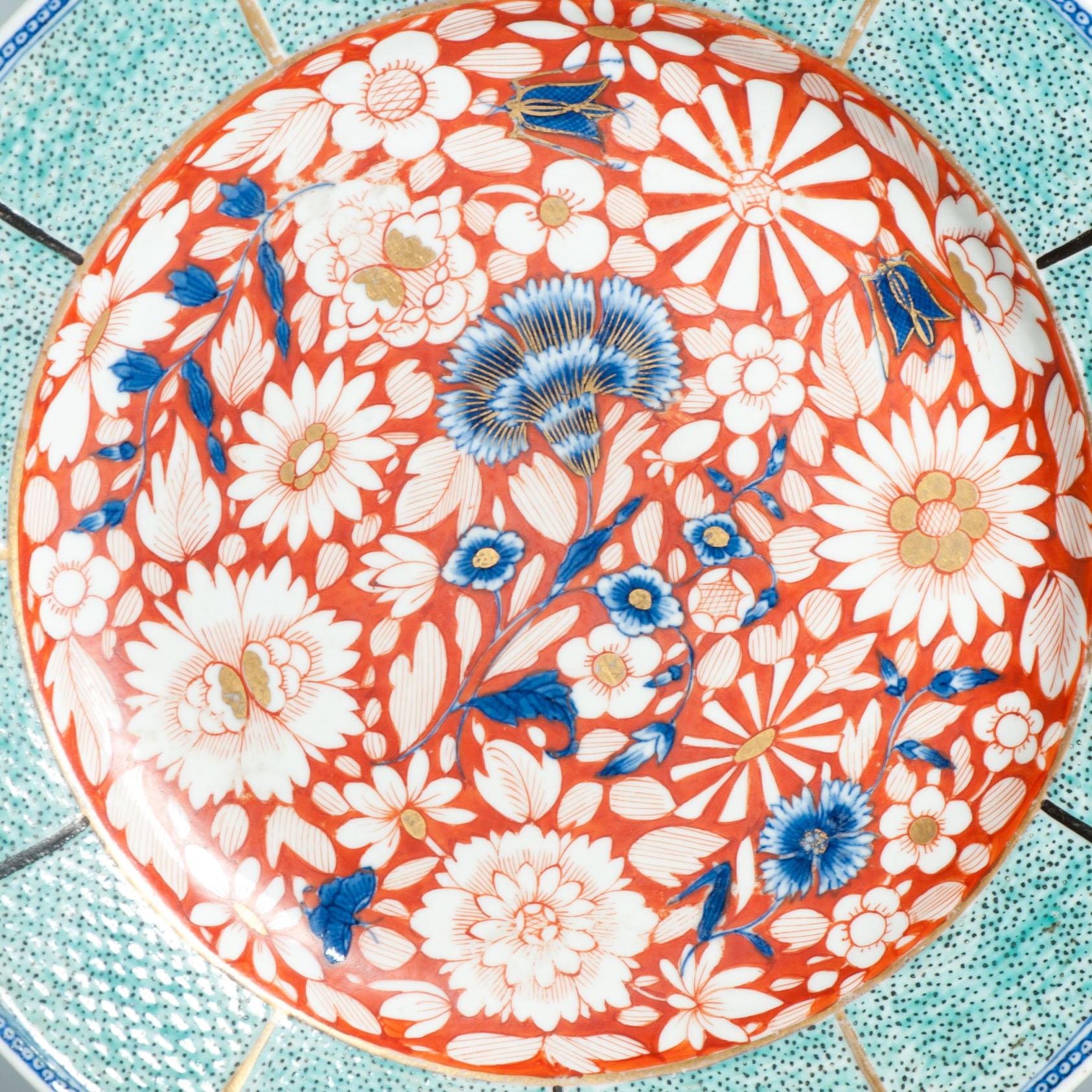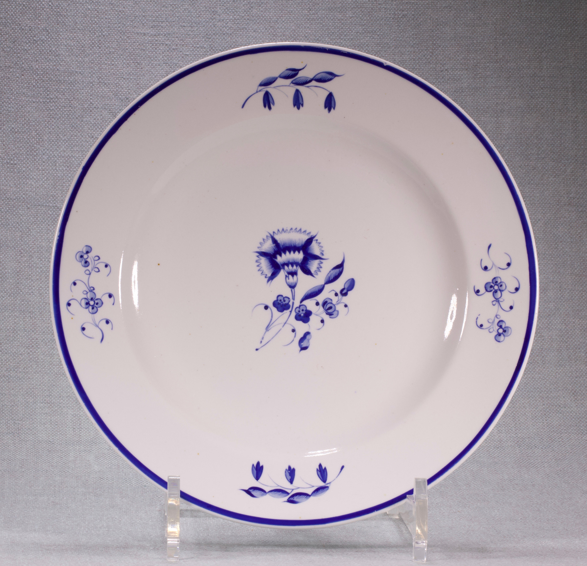 Espir, Helen. European Decoration on Oriental Porcelain, 1700–1830. London/Lisbon: Jorge Welsh Books, 2005.English Regency redecorated plate. This one is rather complicated. Its a very high quality Chinese Qianlong export dish (of the type sometimes called Imperial Quality on export ware) dating to around 1750-1770 with a decoration that copies the famous French Chantilly Sprig pattern. A design that emerged in the 1730/40s on Chantilly Soft past porcelain and was later copied around Europe and also in China. This plate was than later redecorated in the Regency style around 1800-1820 to fit the new fashion of the regency period.