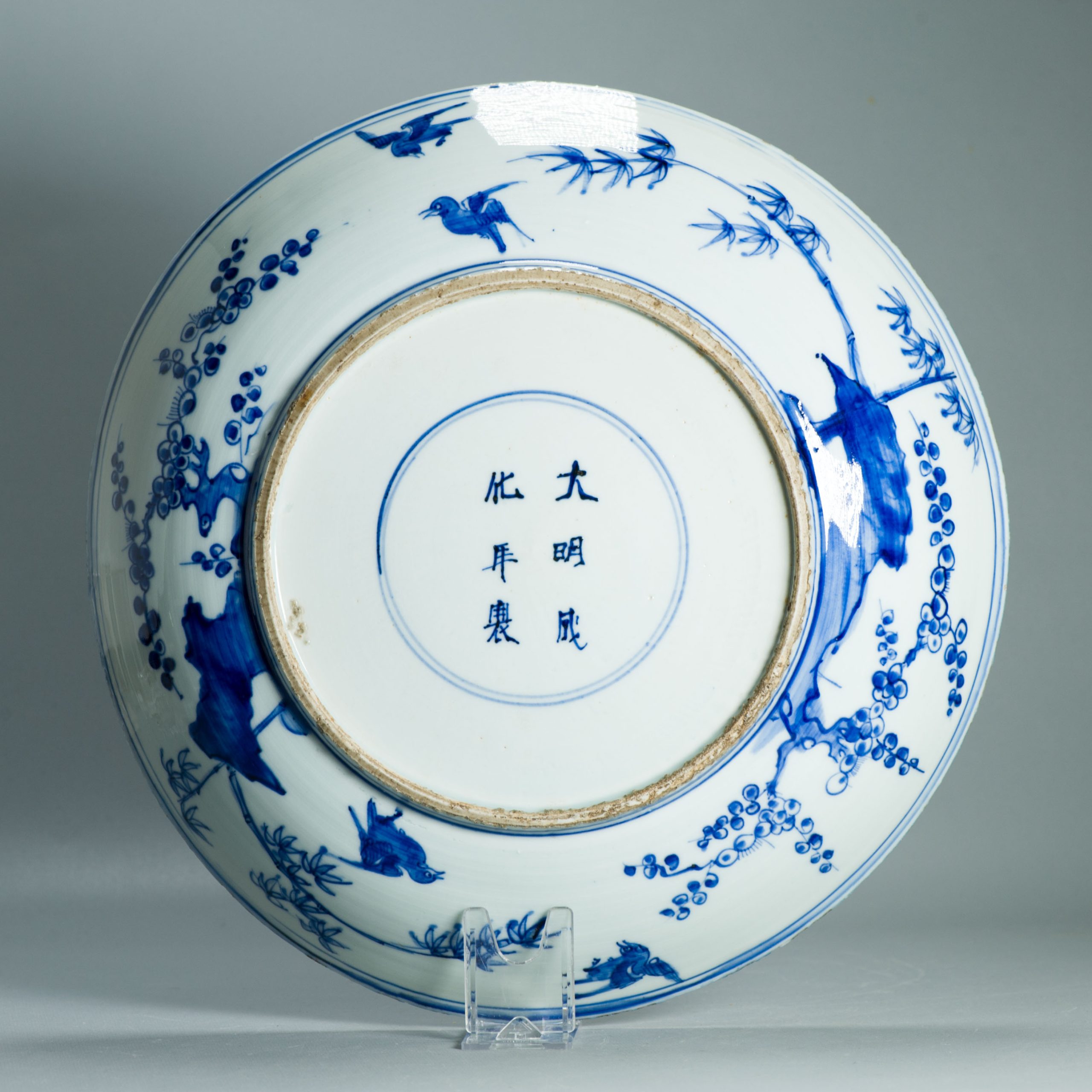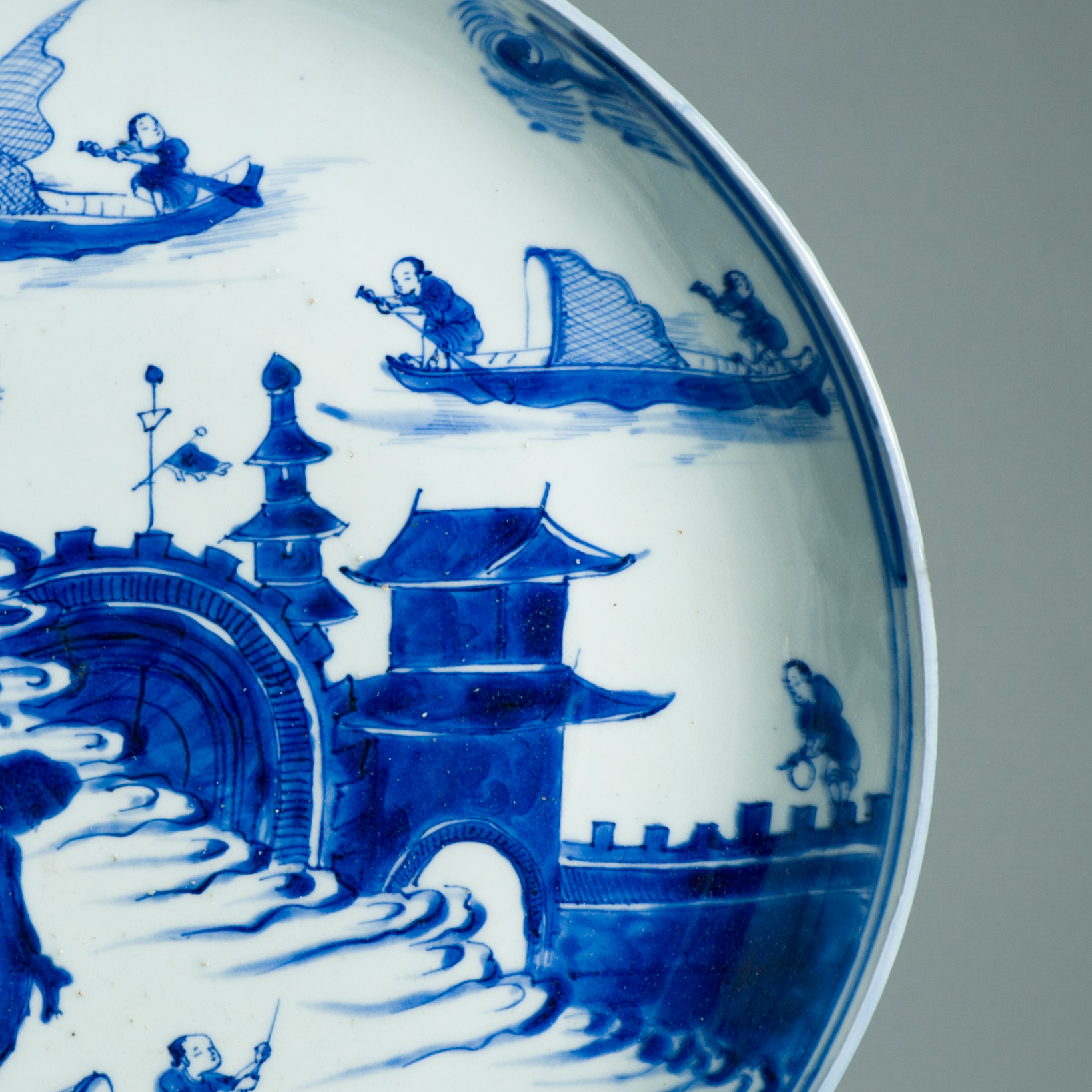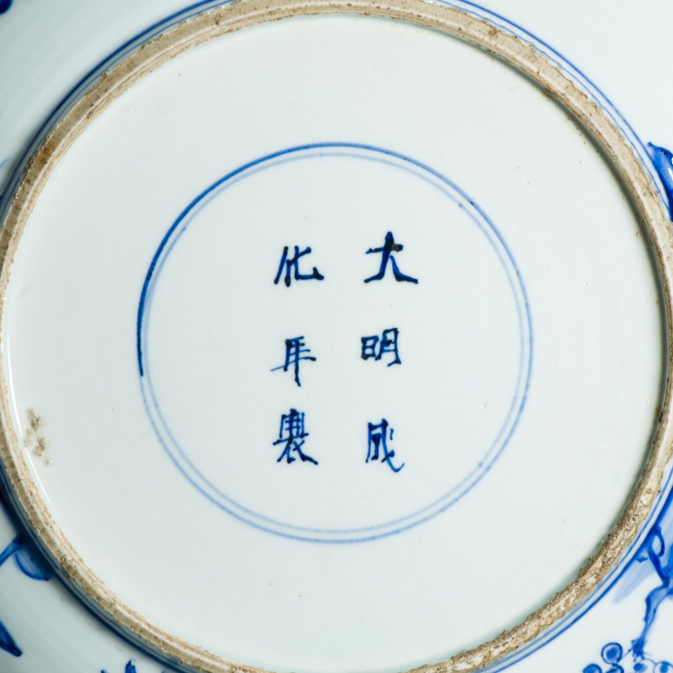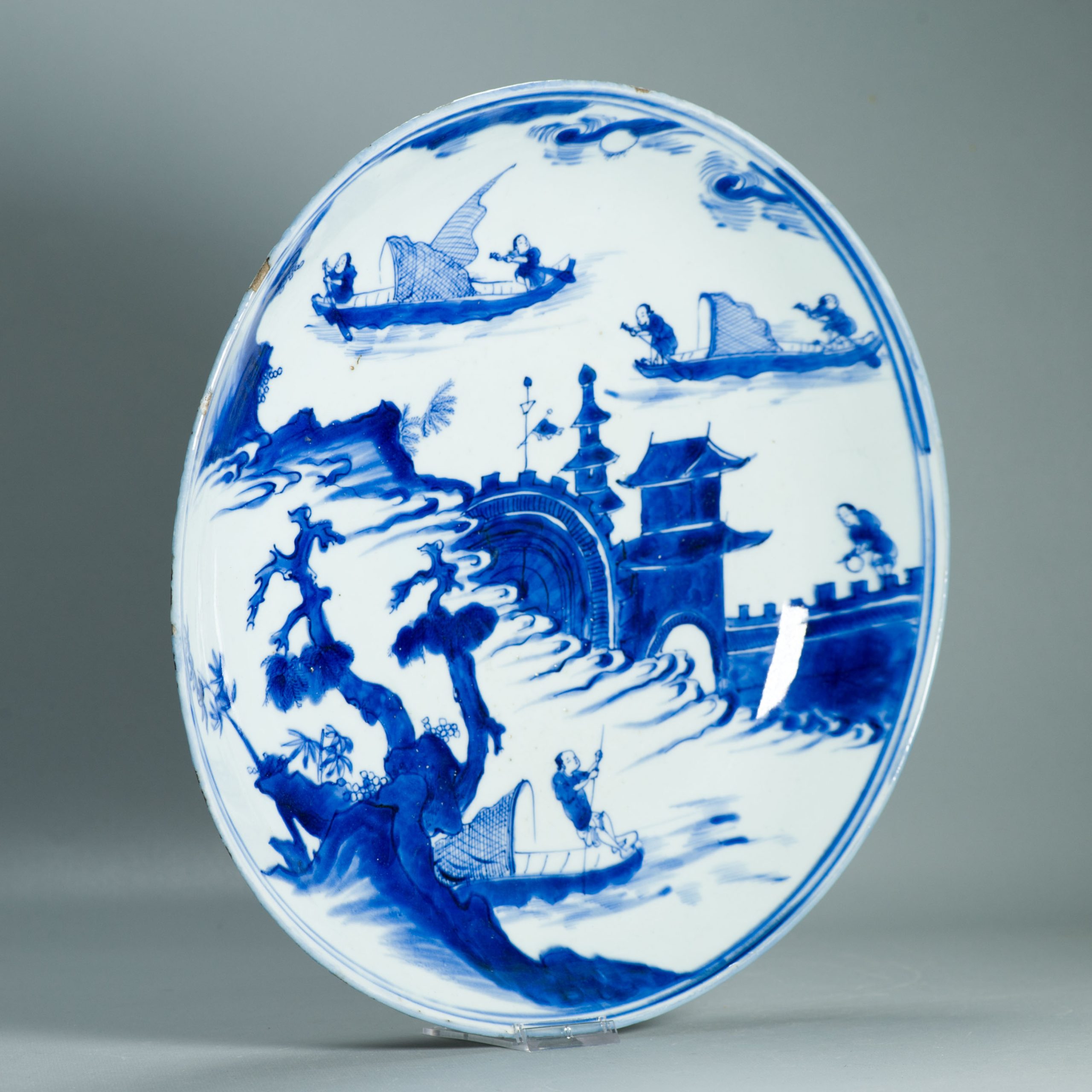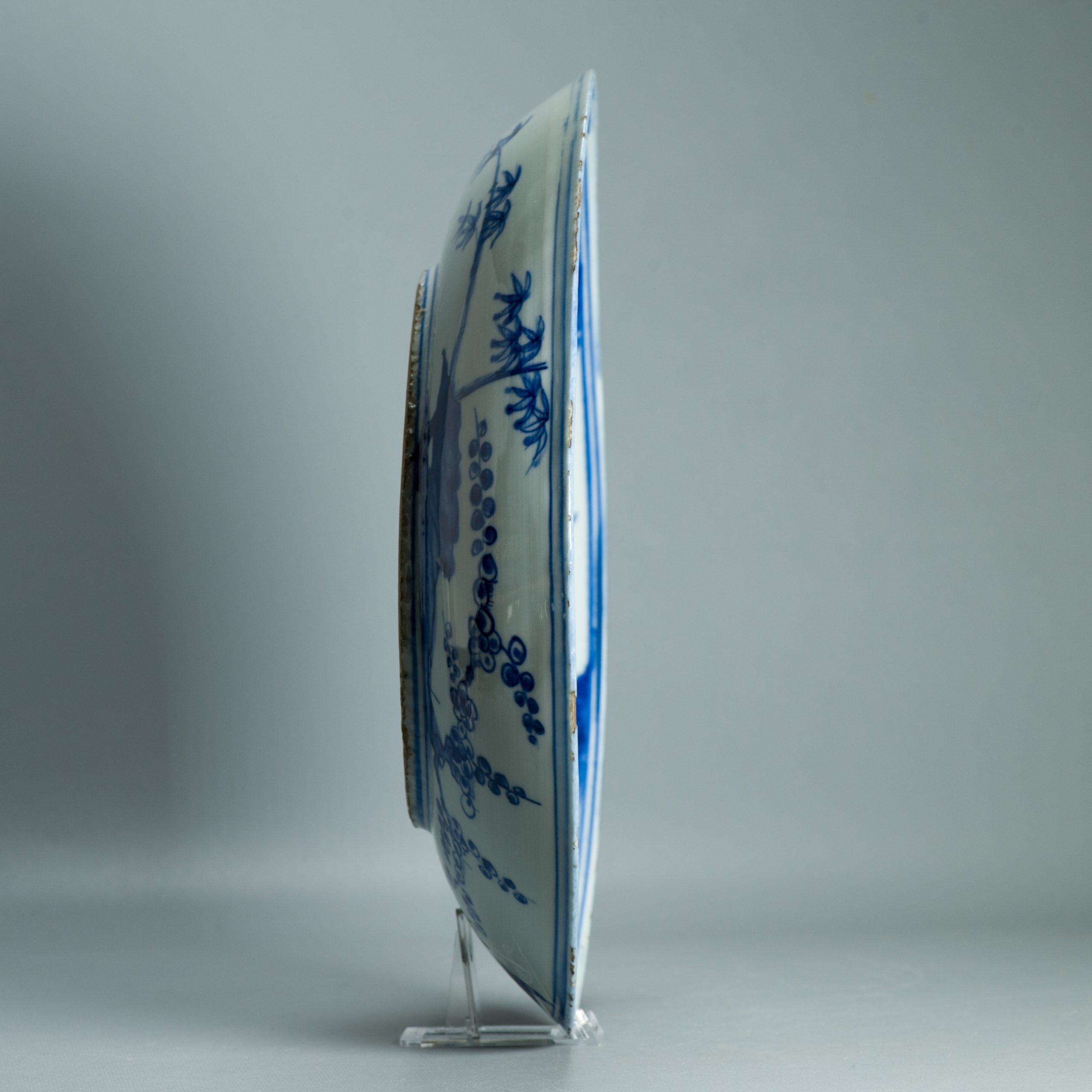 A very nicely potted and painted blue and white Kosometsuke plate. Its really rare to find one of this size. In Japan a range of these larger landscaped dishes with Chengua mark is known. They are made of a type of porcelain body that is closely related to Kraak porcelain as its known in Europe. These are slightly thicker but the glaze is also quit brittle, causing chipping to the Rim