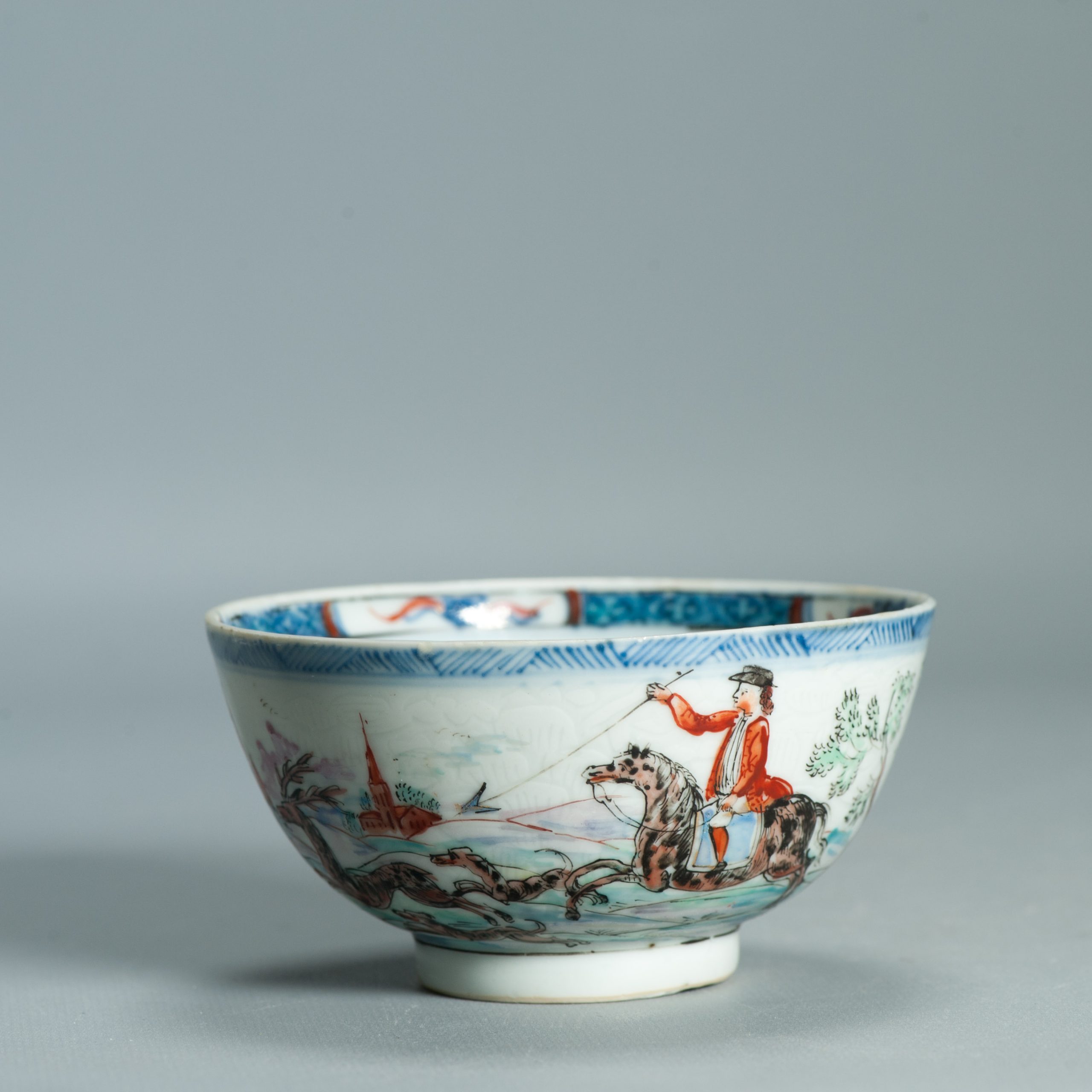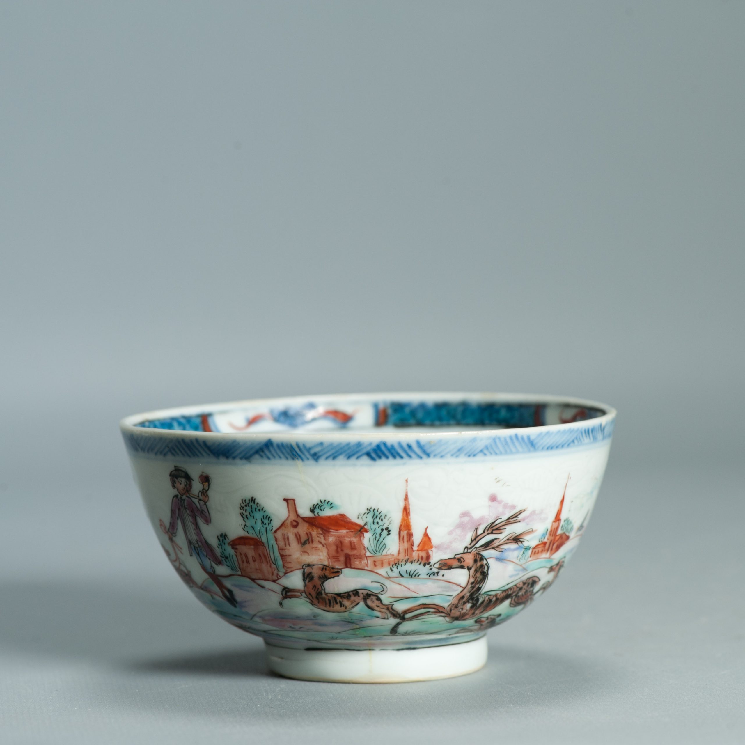 Espir, Helen. European Decoration on Oriental Porcelain, 1700–1830. London/Lisbon: Jorge Welsh Books, 2005.Original bowl with a blue and white and anhua scrollwork. Added a decoration of a Stag Hunt party. Great QUality