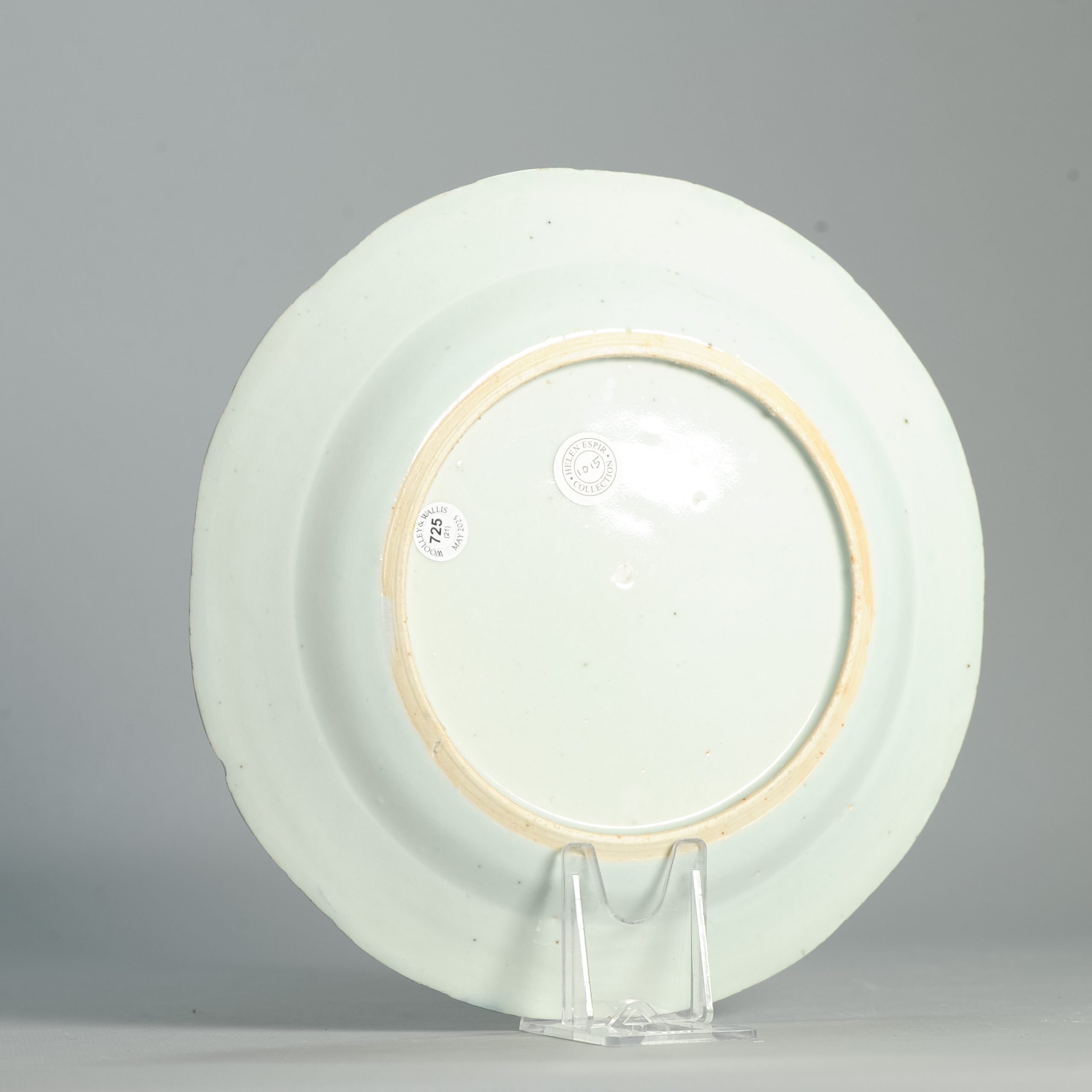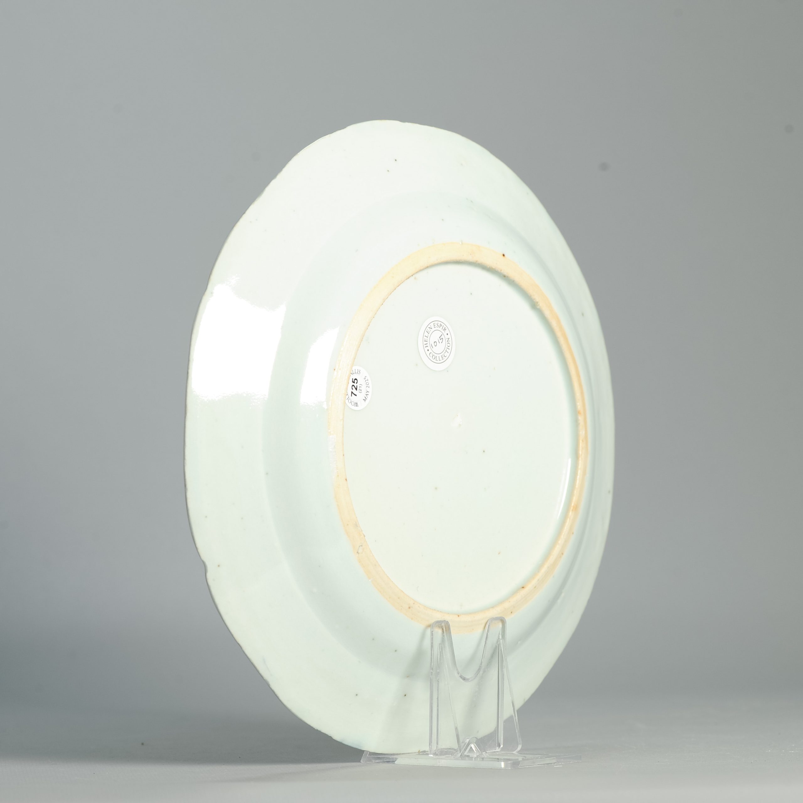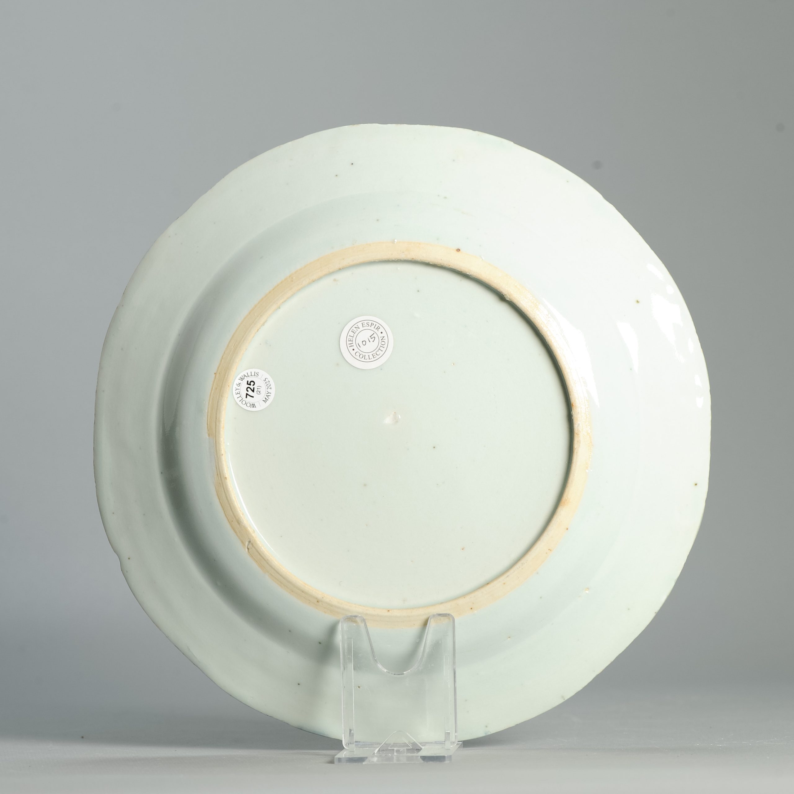 English Regency redecorated plate. This one is rather complicated. Its a very high quality Chinese Qianlong export dish (of the type sometimes called Imperial Quality on export ware)  dating to around 1750-1770 with a decoration that copies the famous French Chantilly Sprig pattern. A design that emerged in the 1730/40s on Chantilly Soft past porcelain and was later copied around Europe and also in China. This plate was than later redecorated in the Regency style around 1800-1820 to fit the new fashion of the regency period.