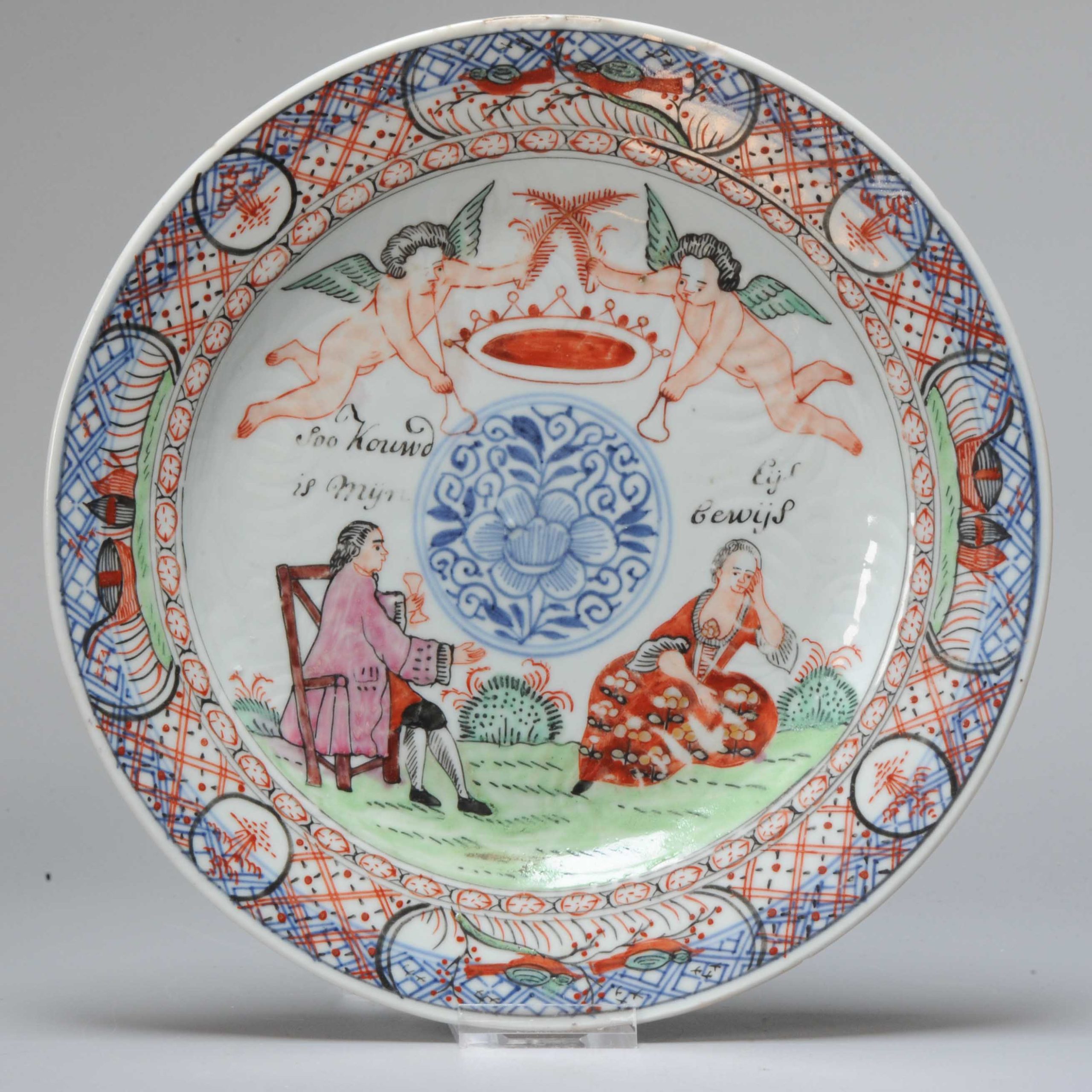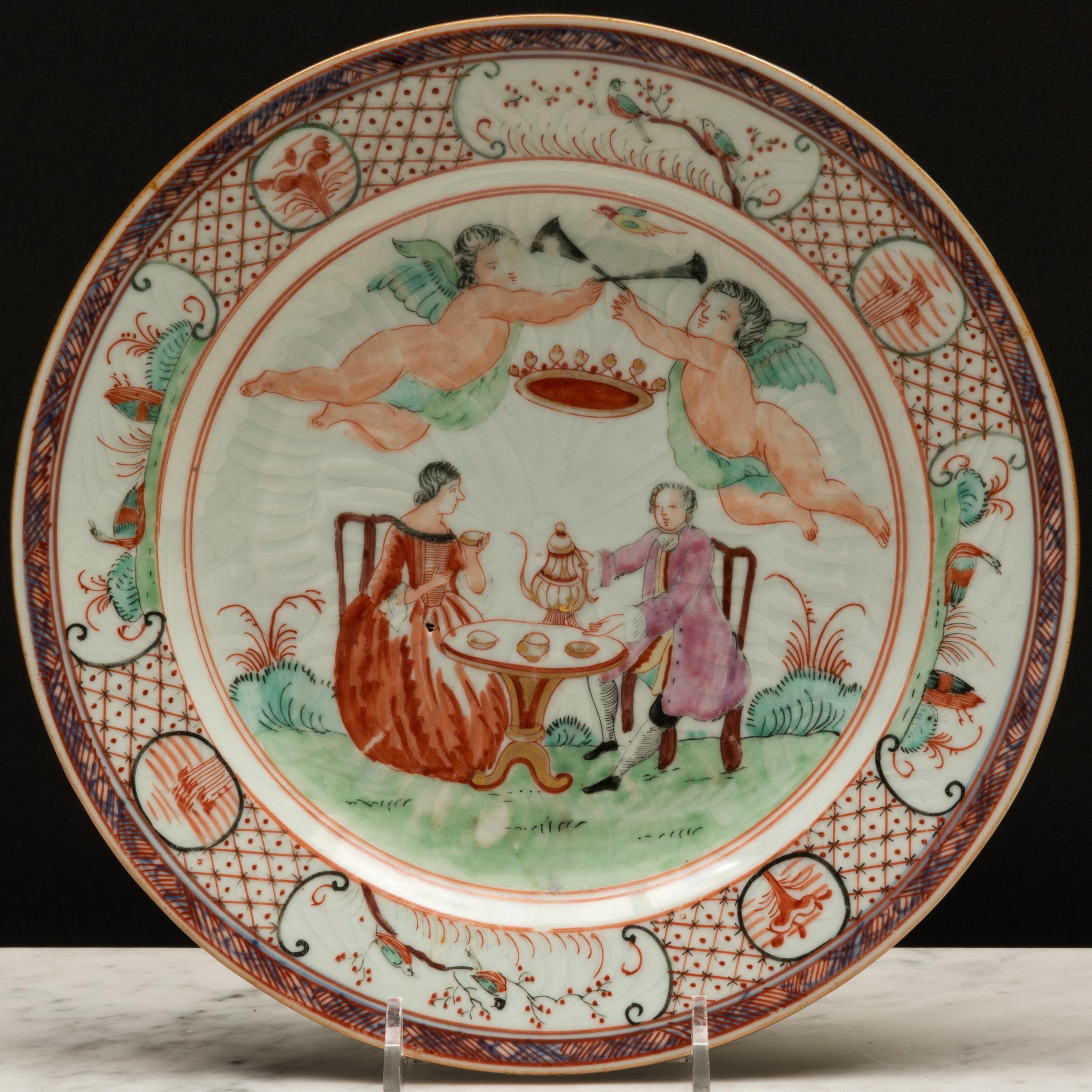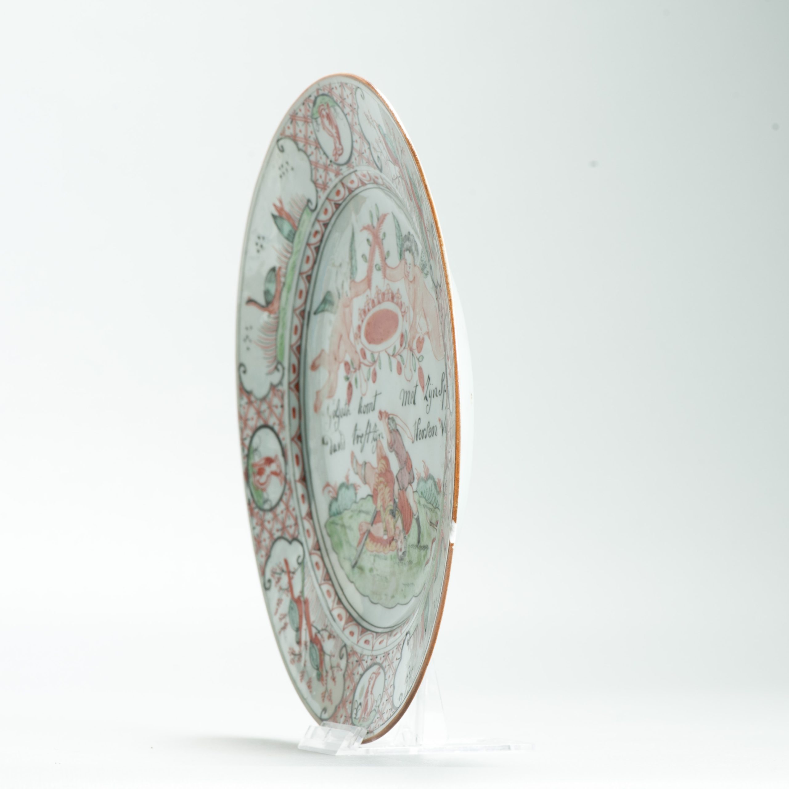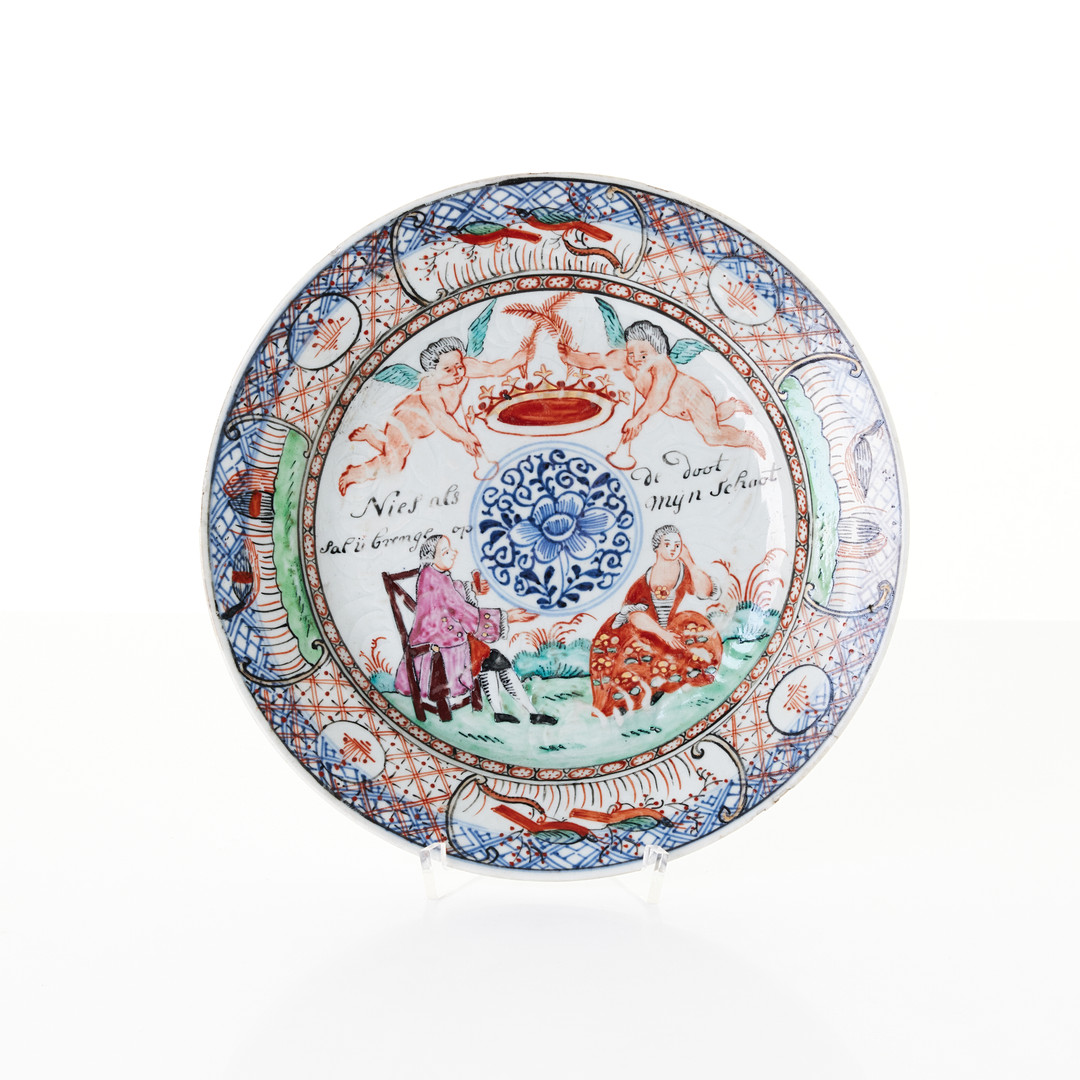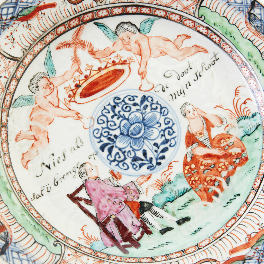 This plate is an example of Amsterdams Bont, a type of Chinese export porcelain overdecorated in the Netherlands in the mid-18th century (ca. 1740-1750). The original blank was produced in China, after which it was enamel-painted in Holland with European-style imagery and text.