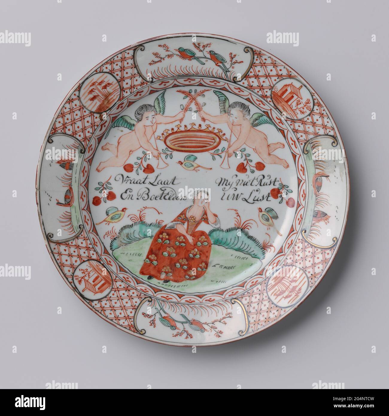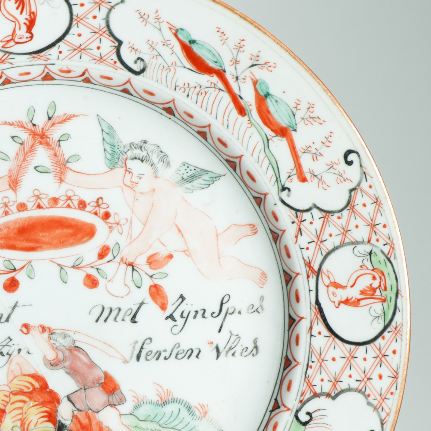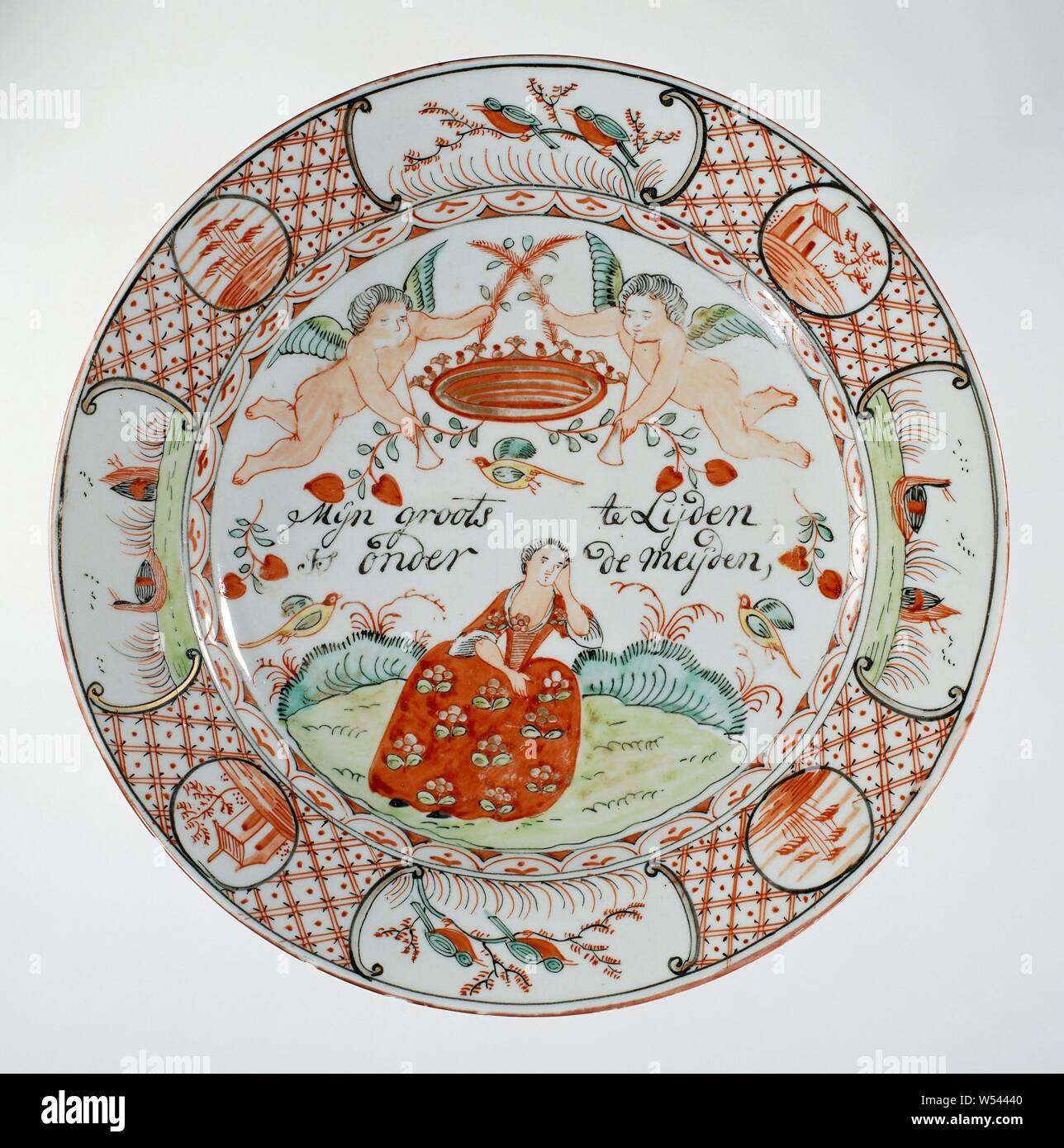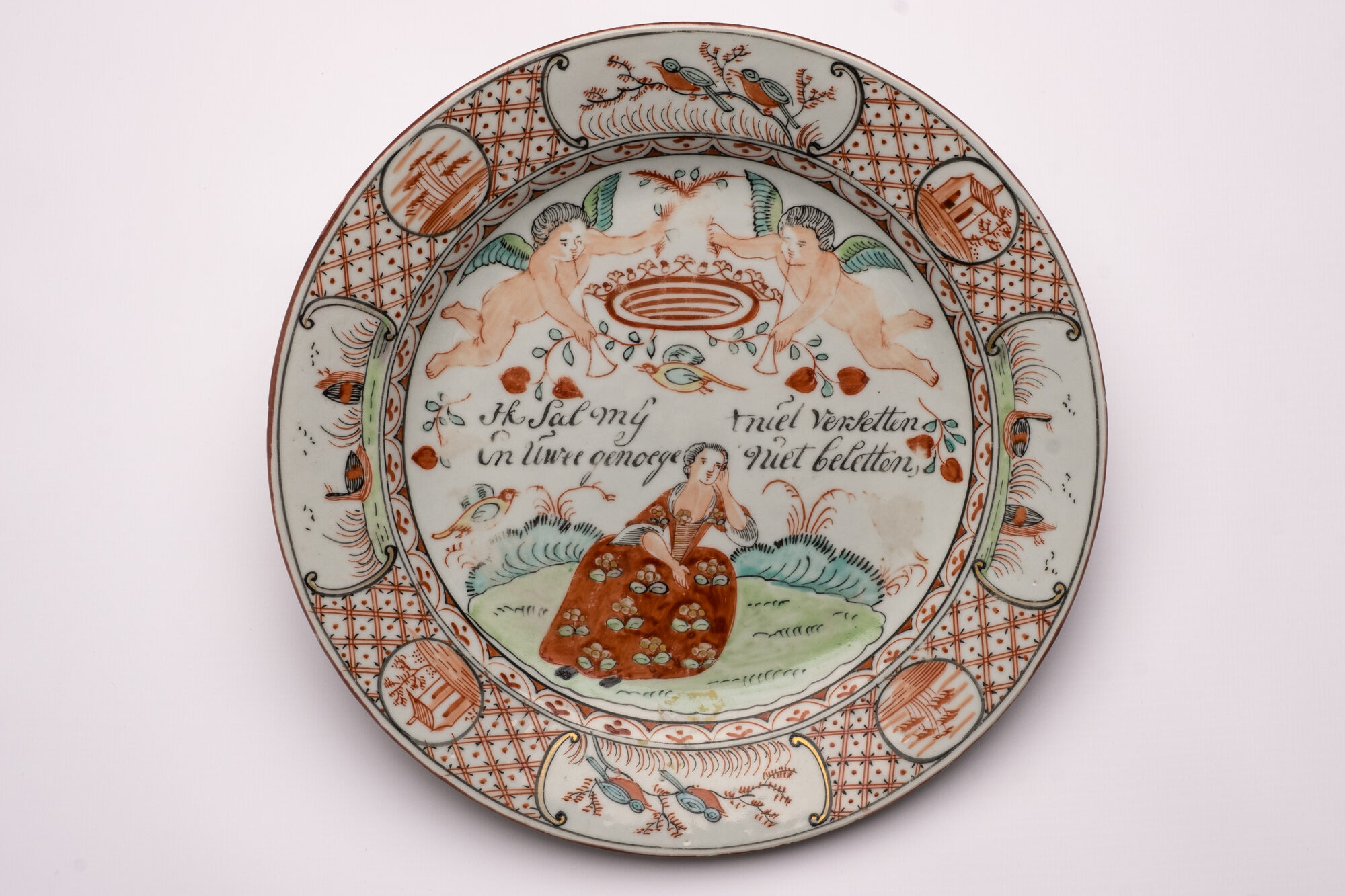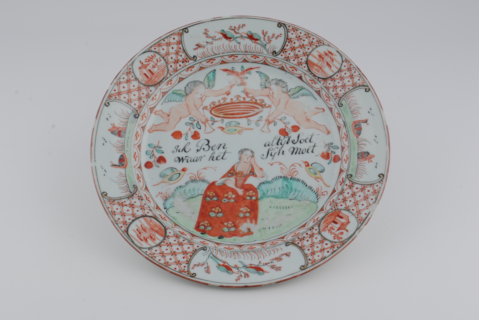 This plate is an example of Amsterdams Bont, a type of Chinese export porcelain overdecorated in the Netherlands in the mid-18th century (ca. 1740-1750). The original blank was produced in China, after which it was enamel-painted in Holland with European-style imagery and text.