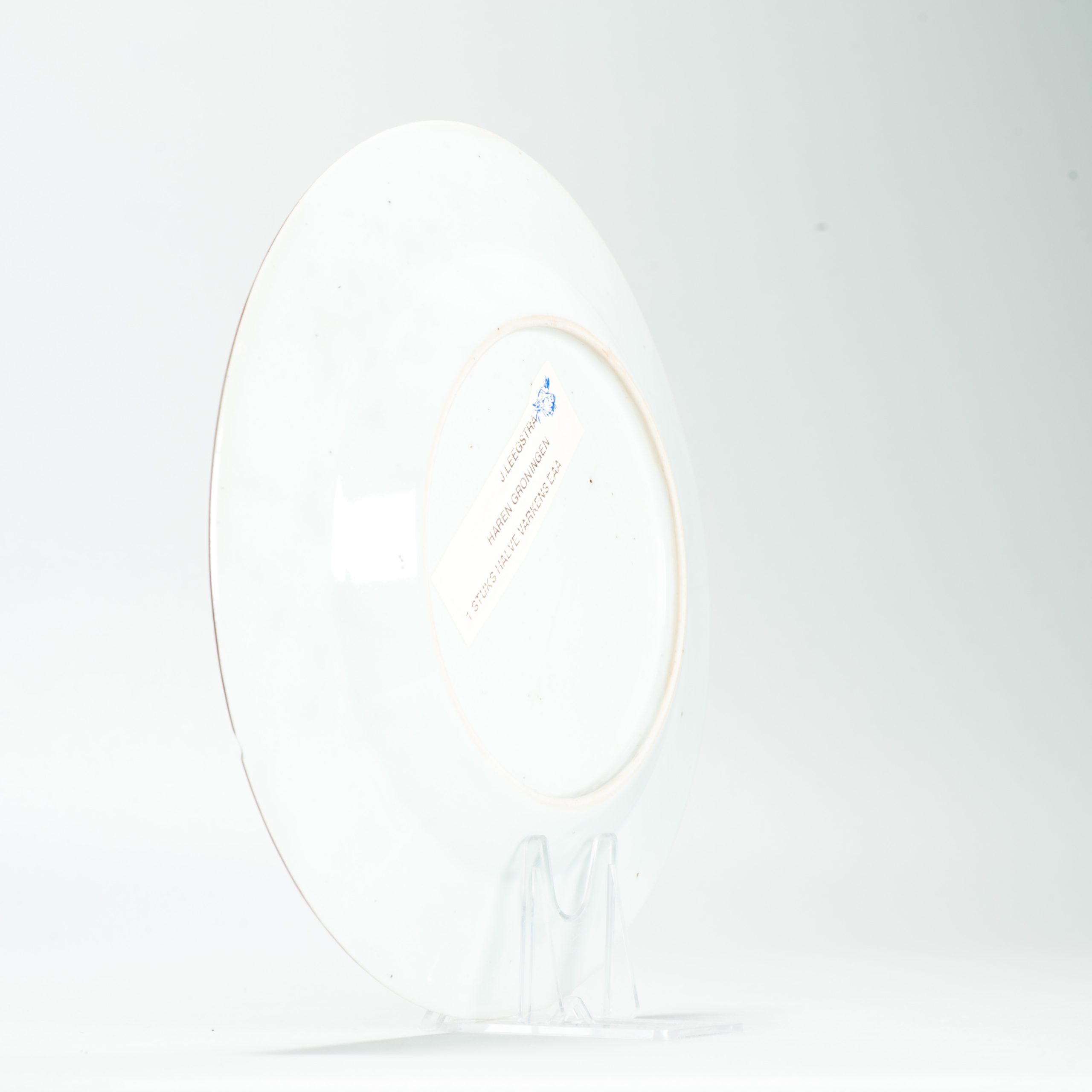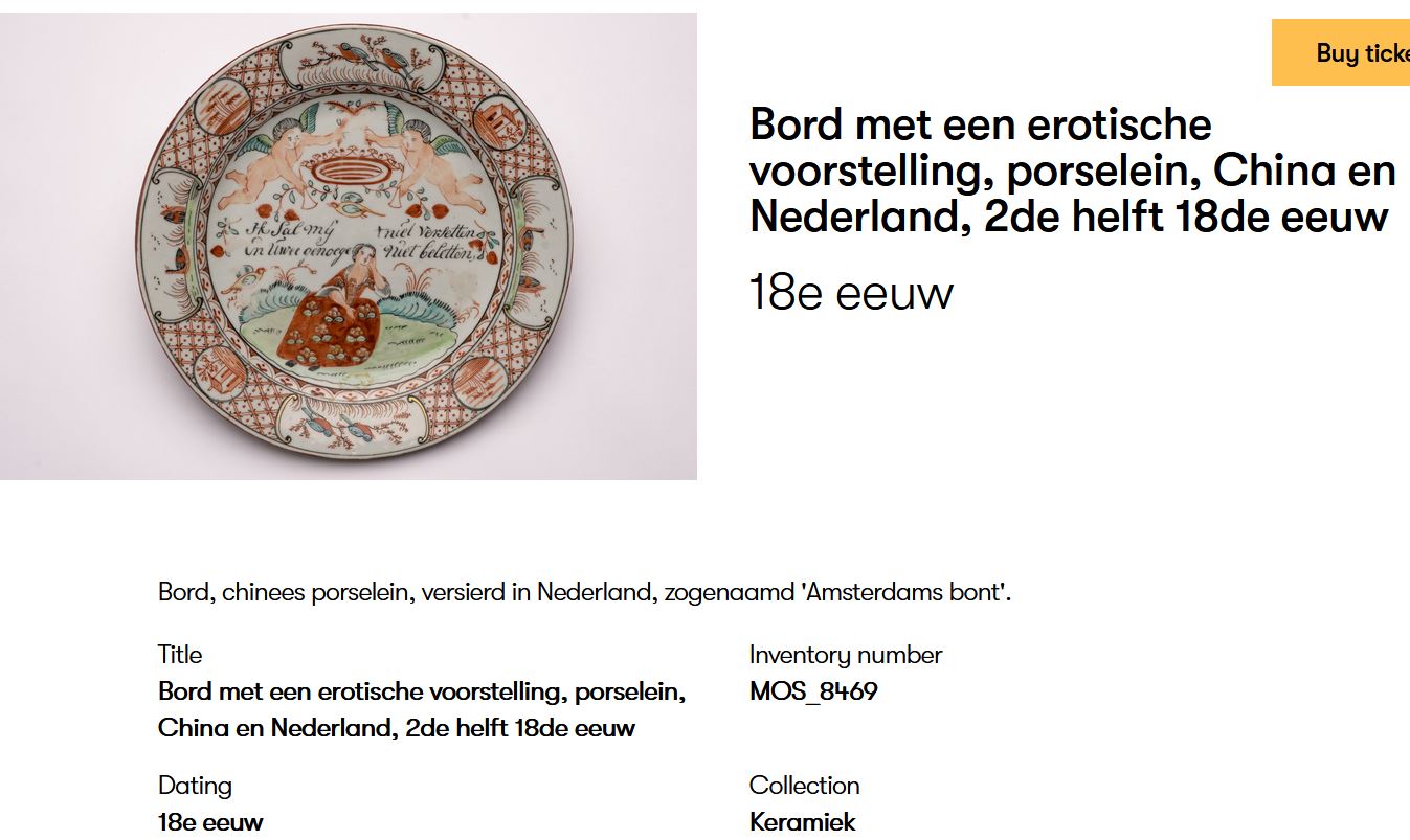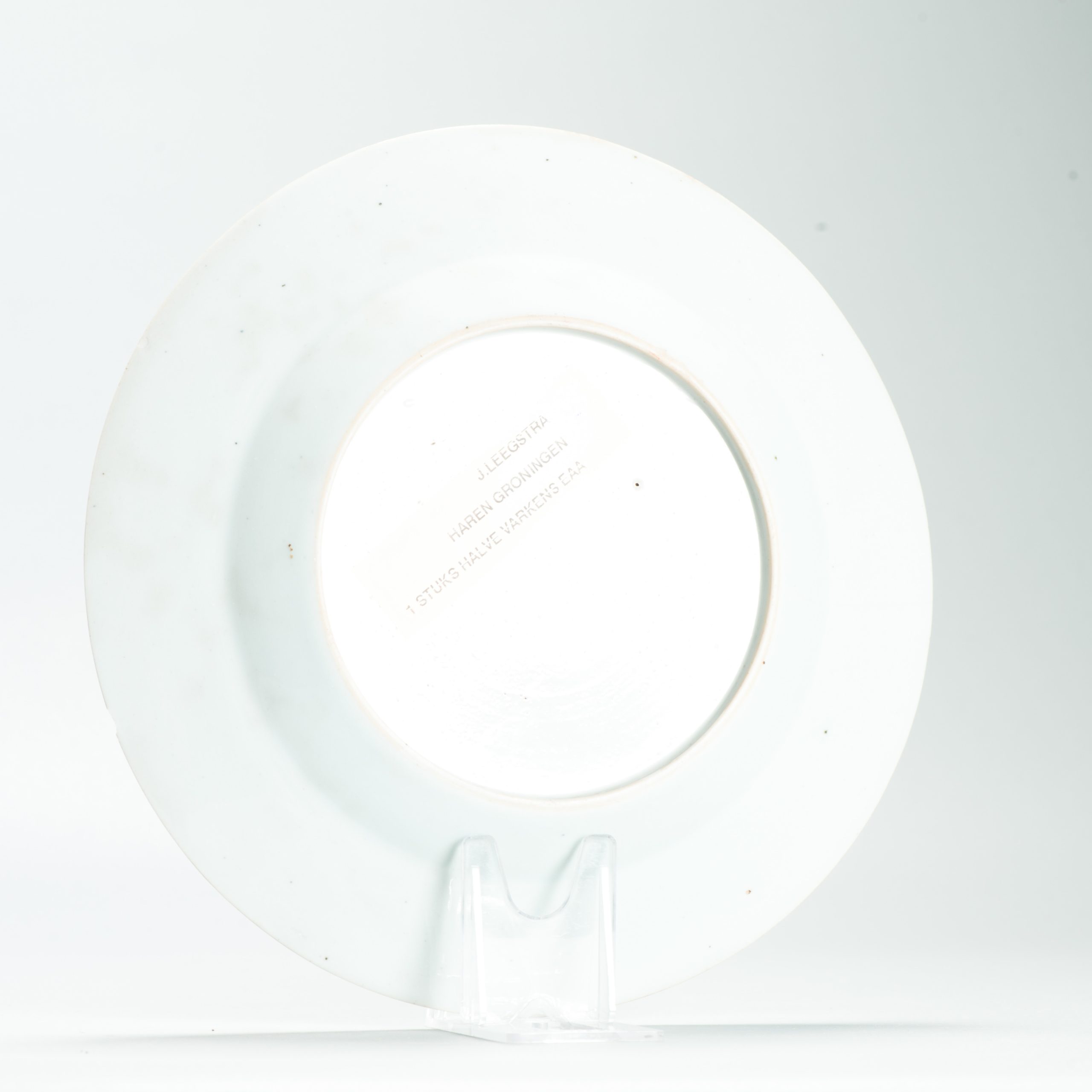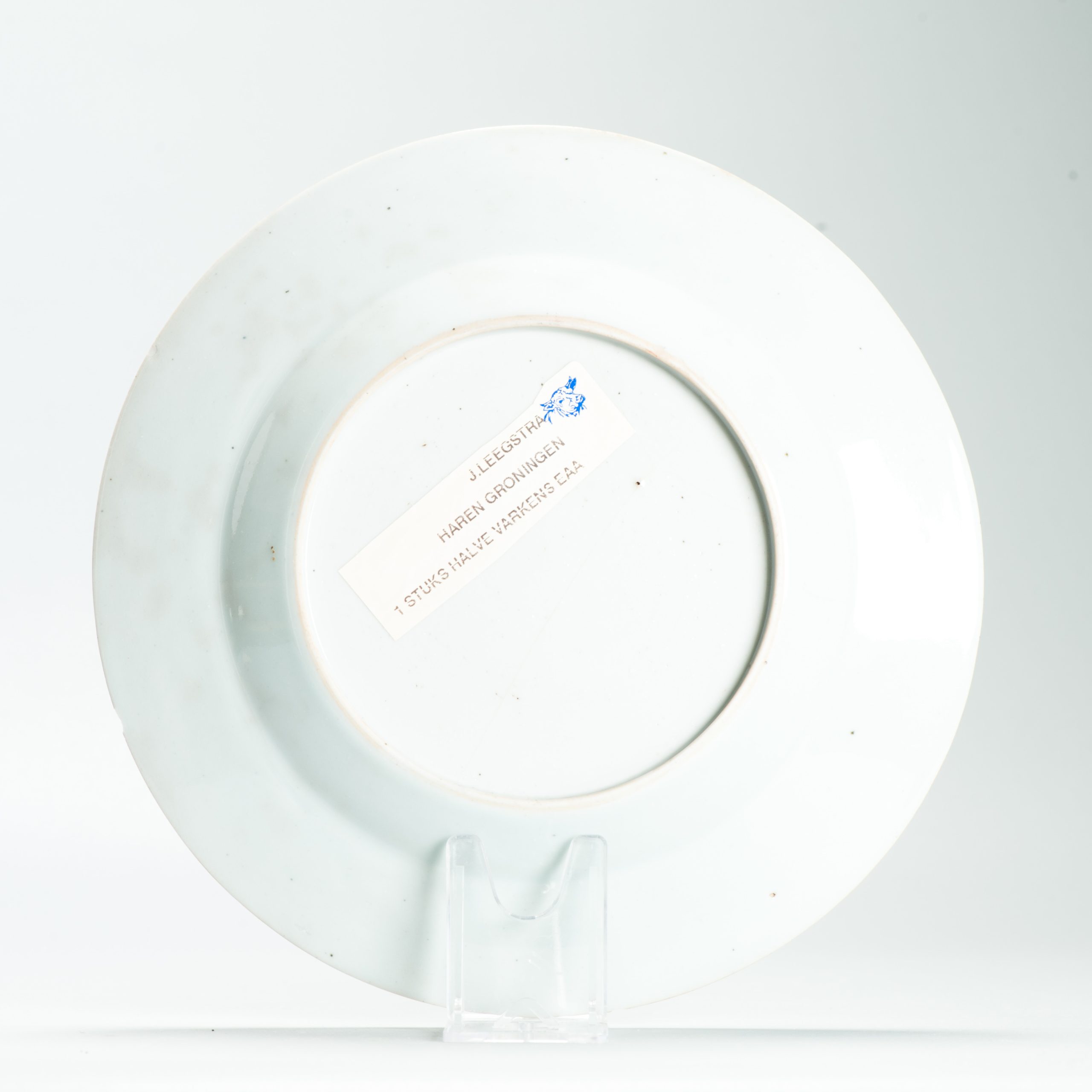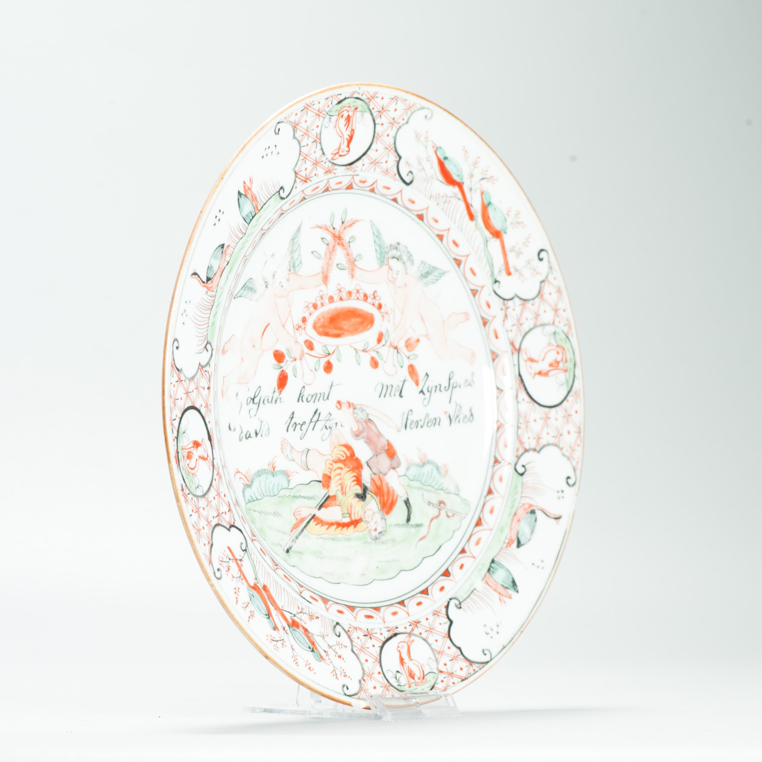 This plate is an example of Amsterdams Bont, a type of Chinese export porcelain overdecorated in the Netherlands in the mid-18th century (ca. 1740-1750). The original blank was produced in China, after which it was enamel-painted in Holland with European-style imagery and text.